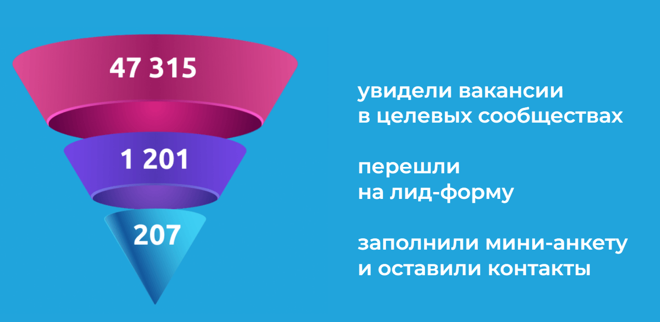 - Для прозрачной аналитики создали персональную лид-форму под каждое из 24 сообществ. Отследили эффективность каждого канала: просмотры, переходы на лид-форму, успешное заполнение и отправка контактов, процент дозвонов до соискателей.
