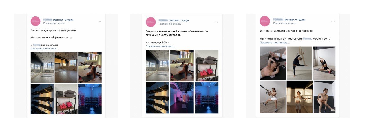 В результате тестов получили 5 наиболее эффективных объявлений, в которых мы рассказывали об открытии нового зала, о преимуществах студии, о направлениях тренировок. Также использовали инфоповод с днем открытых дверей.