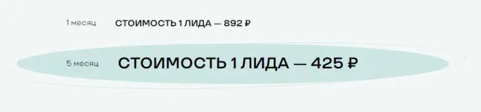 Средняя стоимость 1 лида за 5 месяцев получилась 536 руб. , а за последний месяц 425 руб.