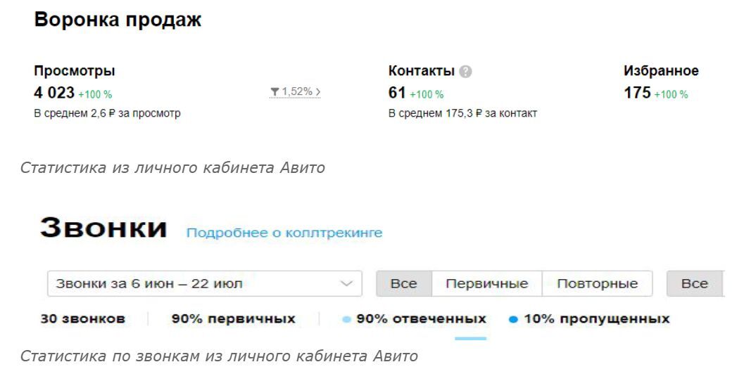 Несмотря на все трудности с модерацией, мы смогли получить 4023 просмотра объявлений менее, чем за 50 дней сотрудничества. Более 30 человек обратились в чат Авито с целью получения консультации и дальнейшего сотрудничества, еще 30 пользователей позвонили через приложение.