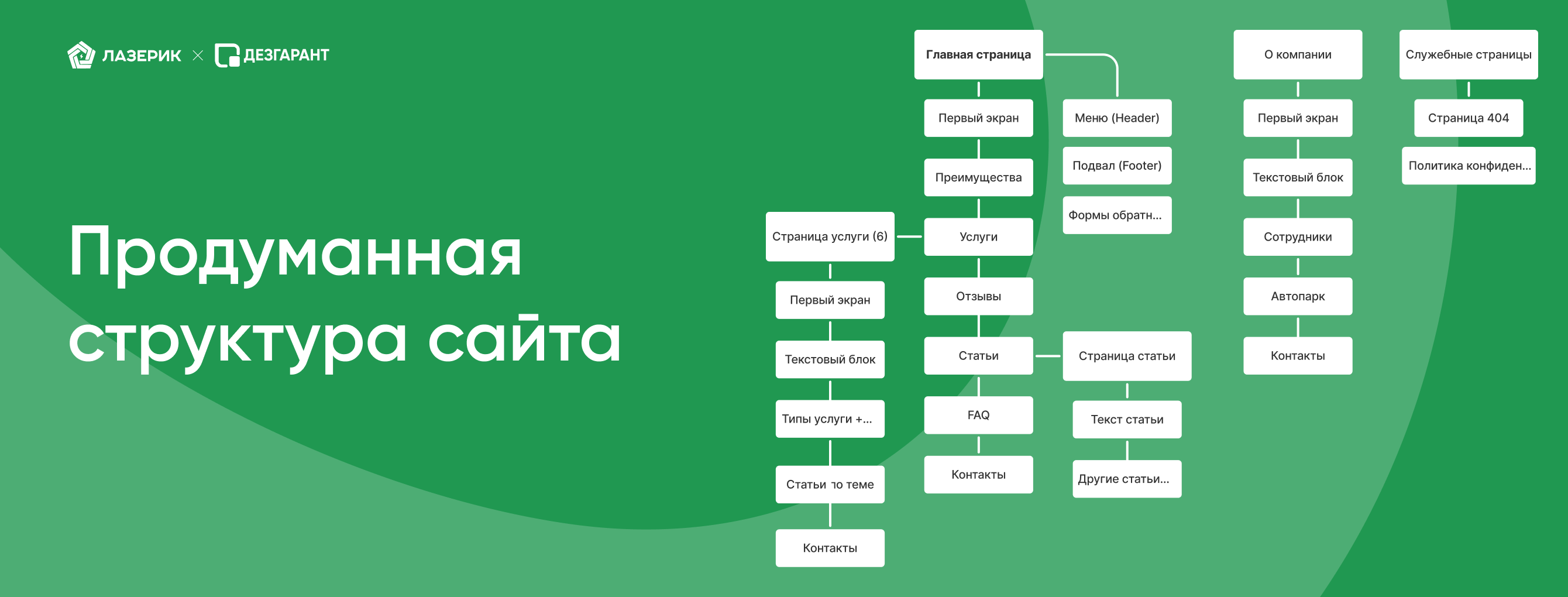 Работая над структурой, мы ориентировались на информацию о нашей компании (так как её было много мы решили создать отдельную страницу «О компании»), конкурентных преимуществах, структуры конкурентов.