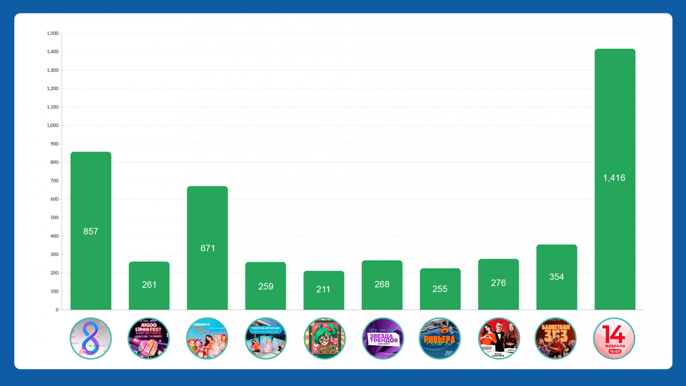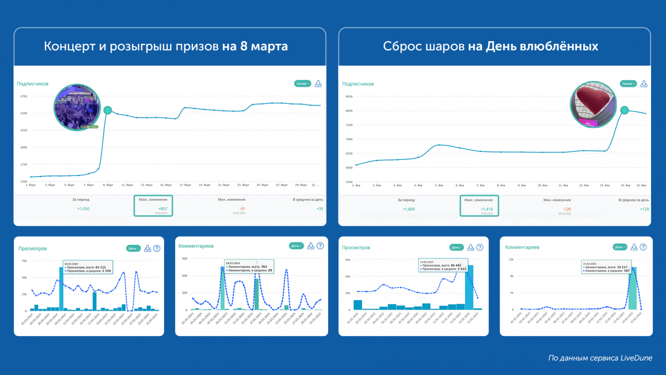 Ниже приводим результаты оффлайн + онлайн активаций с крупнейших событий за прошедший год: концерта и финала розыгрыша призов на 8 марта 2024 года и сброса воздушных шаров на 14 февраля 2025 года.