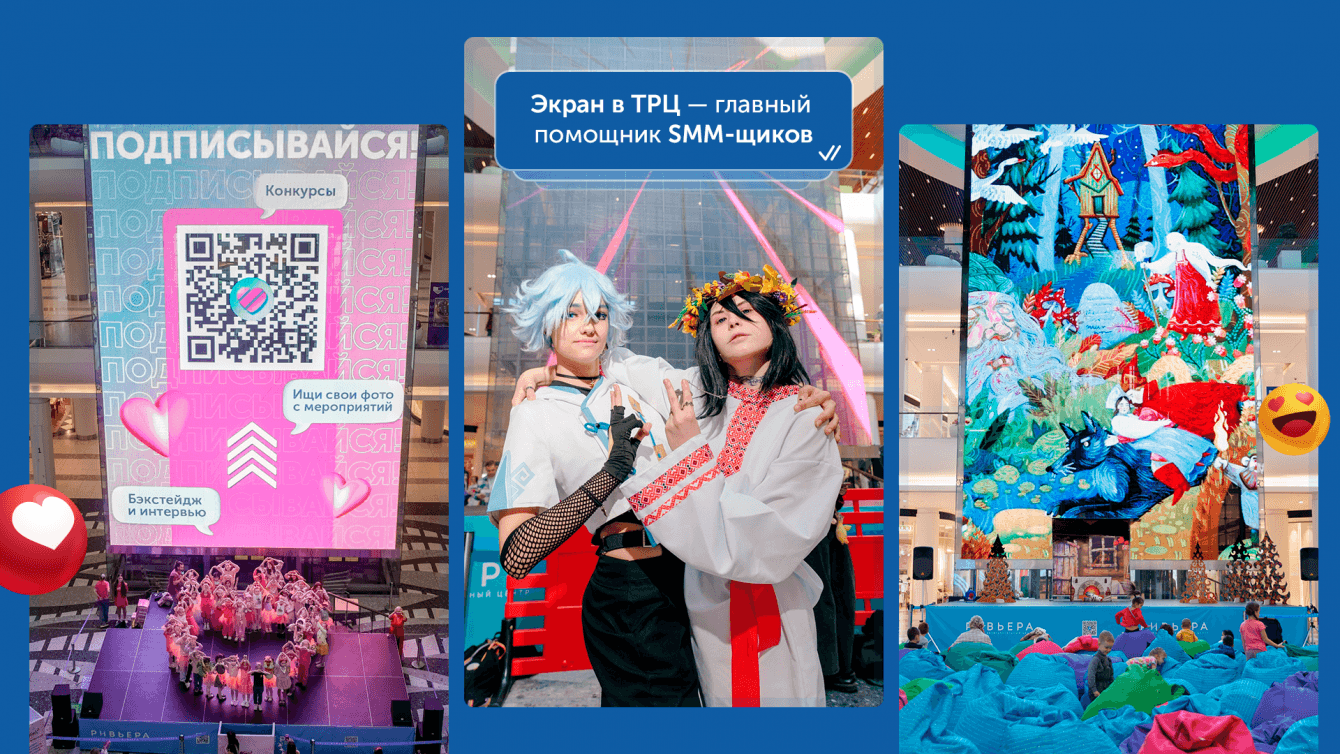 В этом нам помог большой экран в центральном атриуме, который, как оказалось, можно использовать не только в рекламных целях арендаторов, но и для SMM-активаций (стоит только предложить).