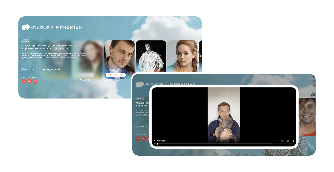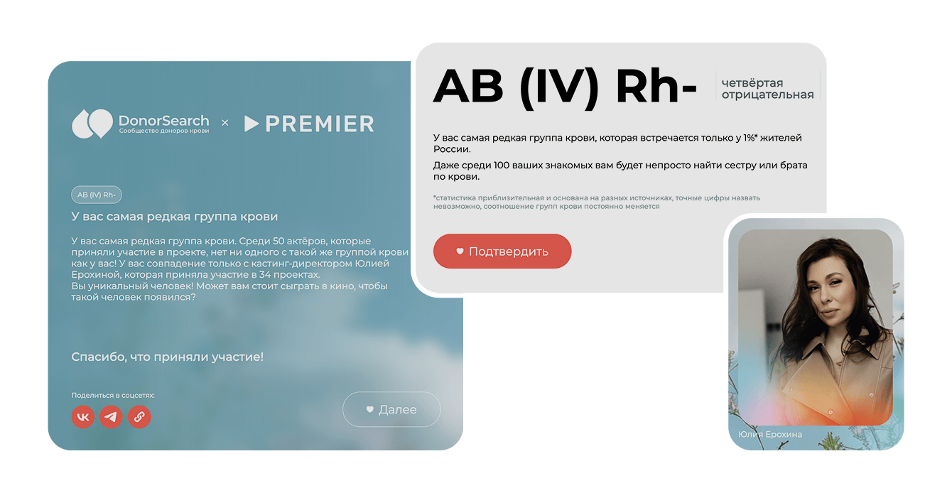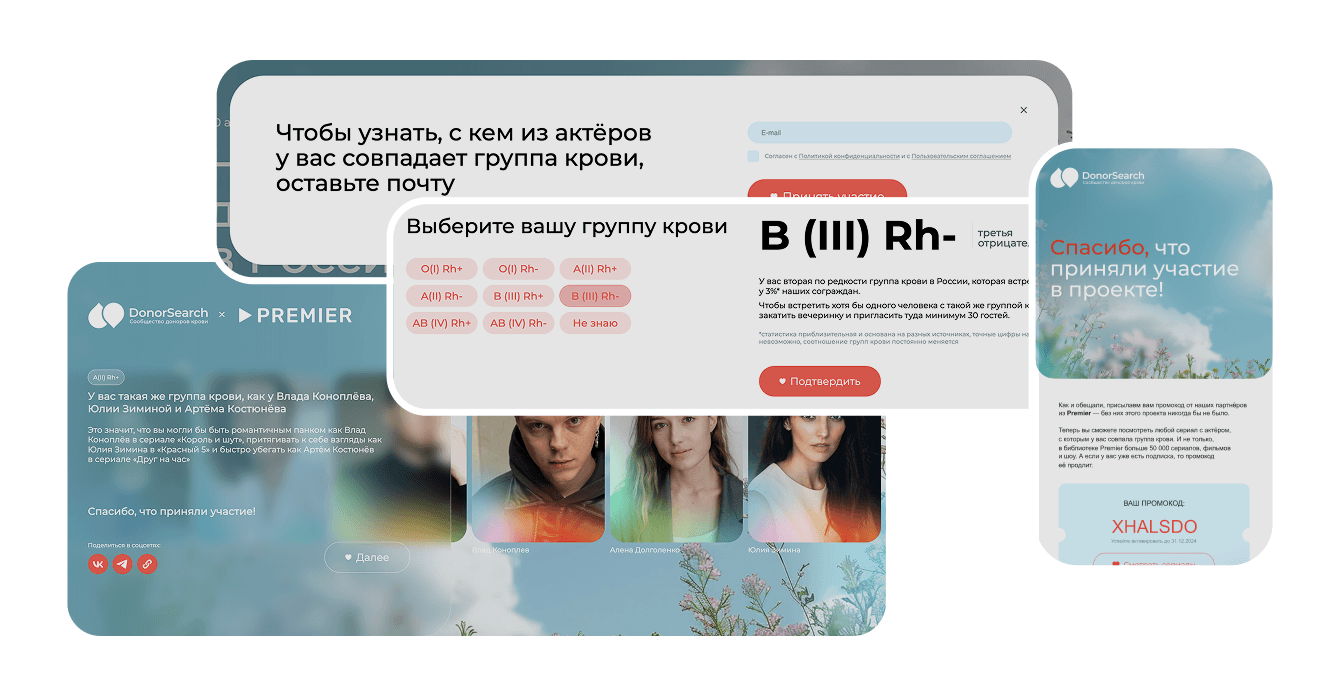 НКО DonorSearch популяризирует донорство, главное в этом процессе — кровь. Онлайн-кинотеатр Premier показывает фильмы и сериалы, главные тут — актёры. А на стыке мы получаем тиндер: укажи свою группу крови и узнай, с кем из известных актёров у тебя мэтч.