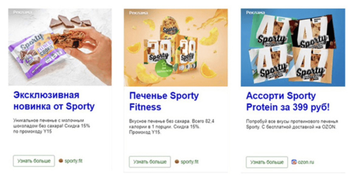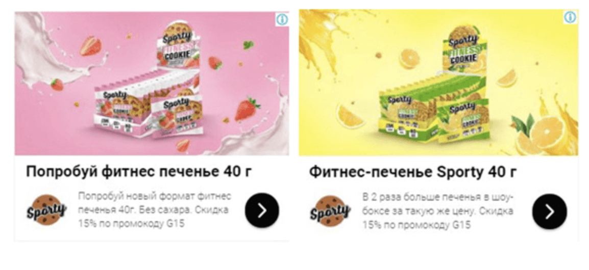 В текстово-графических объявлениях РСЯ и КМС использовались яркие изображения, тестировались различные варианты заголовков, с указанием цены (как одного из преимуществ) и эксклюзивных новинок.