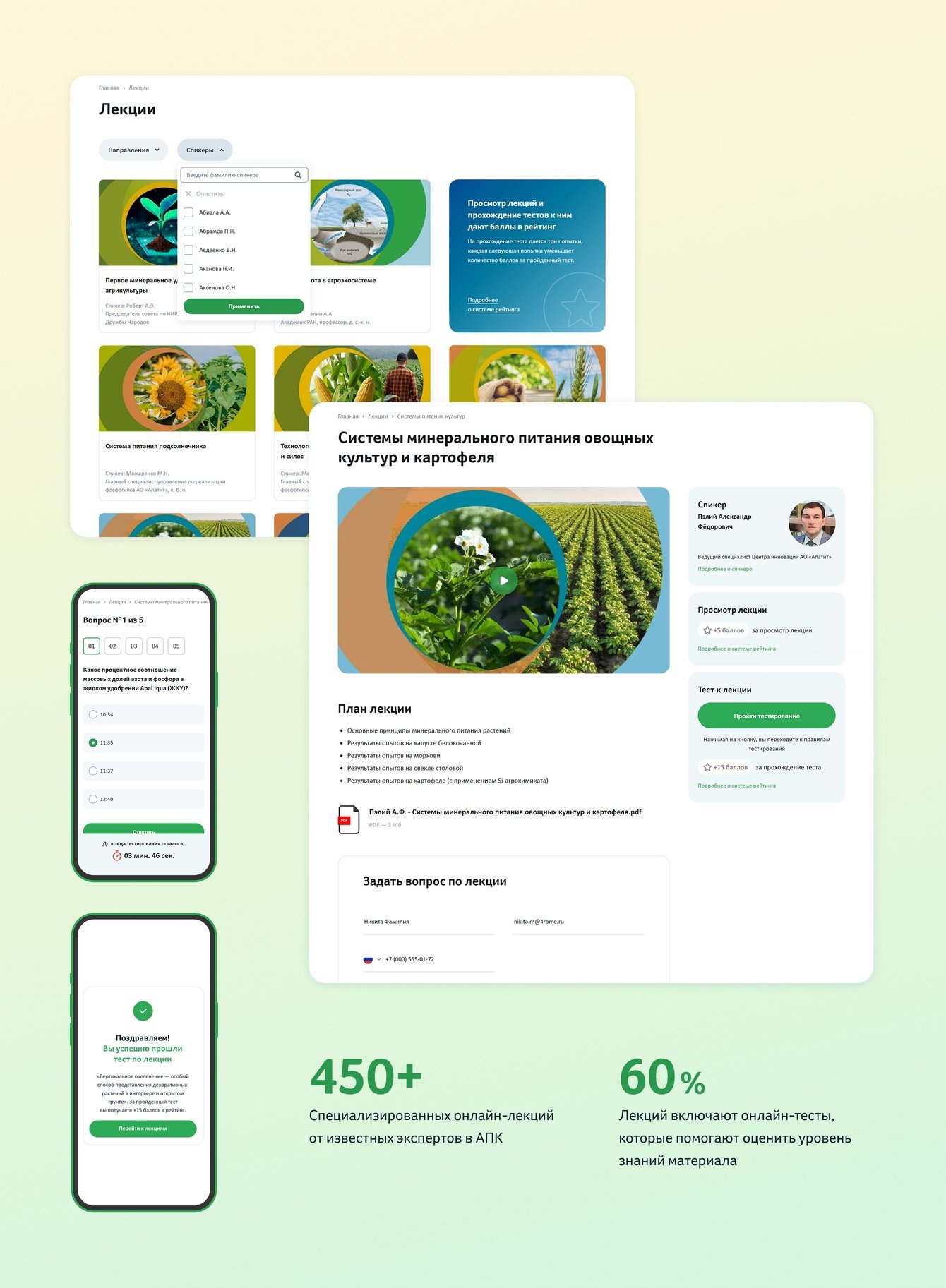 Нашей основной задачей стало создание полноценной образовательной платформы с лекциями от ведущих экспертов в сельском хозяйстве, с возможностью проверки знаний, системой рейтинга, аналитикой, системой личных кабинетов и разными языковыми версиями. Кроме того, необходимо было создать функционал для карьерного развития: предоставить студентам возможность формировать резюме, а работодателям — размещать вакансии.