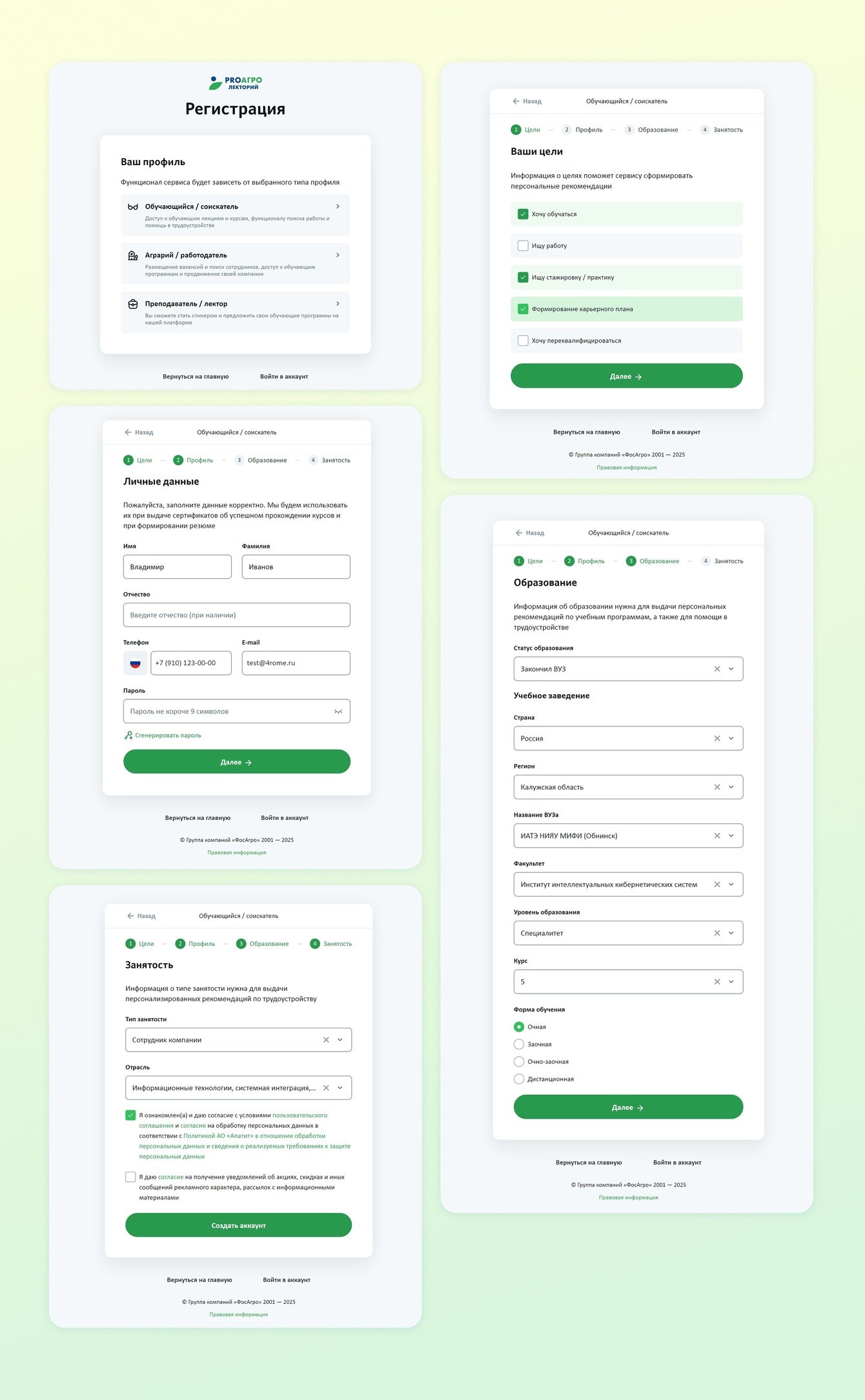 В Лектории три роли: обучающийся/соискатель, аграрий/работодатель, преподаватель. Мы создали подробную форму регистрации и разбили ее на этапы для удобства, чтобы каждый получал релевантный функционал и контент. Например, работодатель пользуется инструментами для подбора персонала, а обучающийся — курсами, лекциями и вакансиями.