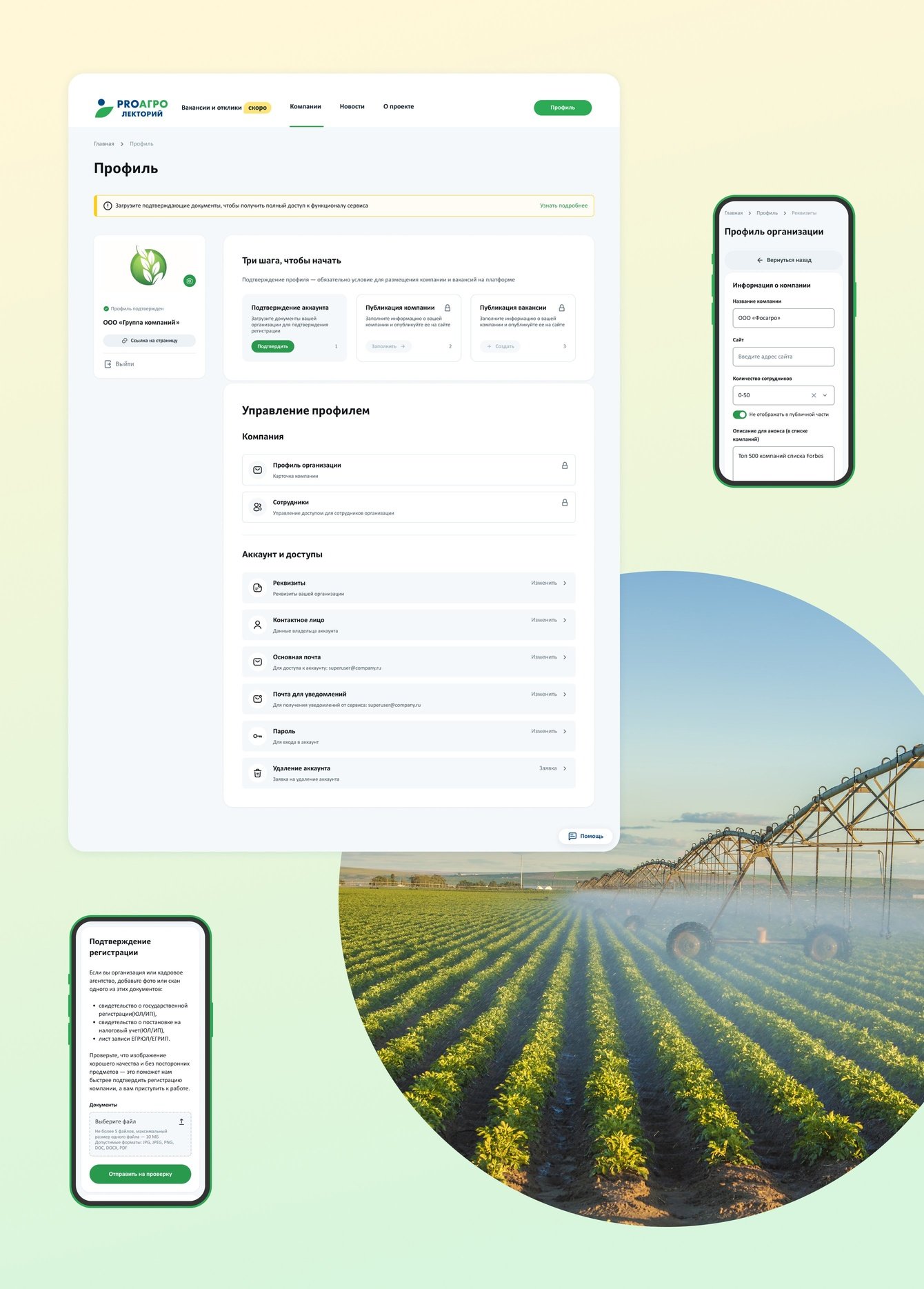 Компаниям в сфере АПК важно быстро находить сотрудников и формировать репутацию надежного работодателя. Поэтому мы добавили регистрацию и систему модерации пользователей, личный кабинет для управления профилем организации, карточку компании с логотипом, регионом присутствия, преимуществами работодателя.