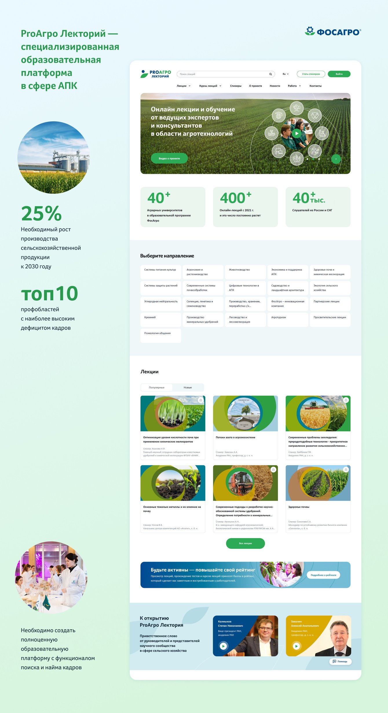 В 2023 году «ФосАгро», один из крупнейших мировых производителей фосфорсодержащих удобрений, дал старт развитию цифровой образовательной платформы «ProАгро Лекторий» для аграриев и студентов аграрных вузов. Это стало первым шагом в реализации совместной инициативы «ФосАгро» и Минсельхоза России по развитию цифровых компетенций в российских аграрных вузах.