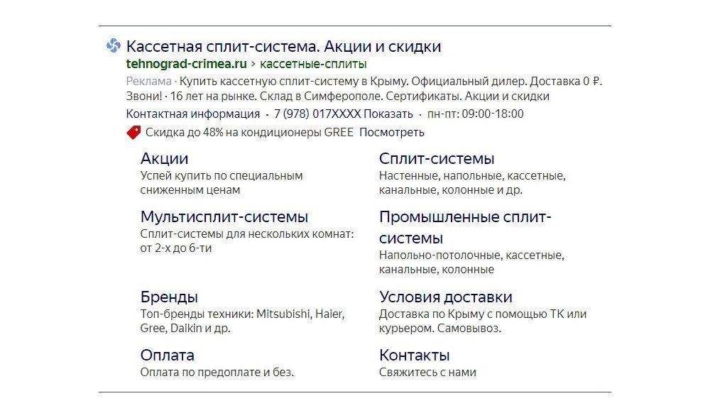 Динамические объявления формируются автоматически на основе данных товарного фида. Группы сегментированы по типам сплит-систем: напольные, кассетные и т.д. Пользователю показываются максимально релевантные объявления: заголовок динамического объявления полностью соответствует введенному поисковому запросу.