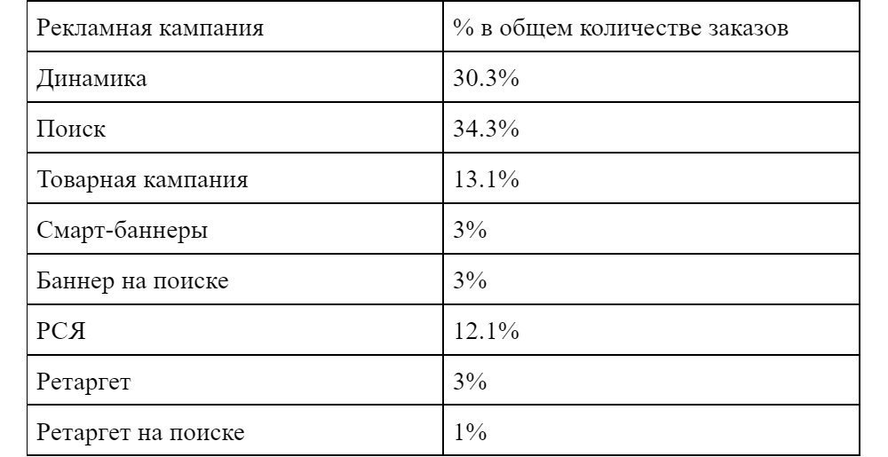 Основные рекламные кампании (с точки зрения оформления заказов в корзине) - поиск и динамика. Также неплохо срабатывает товарная кампания. Цена клика по ней - меньше 13 рублей.