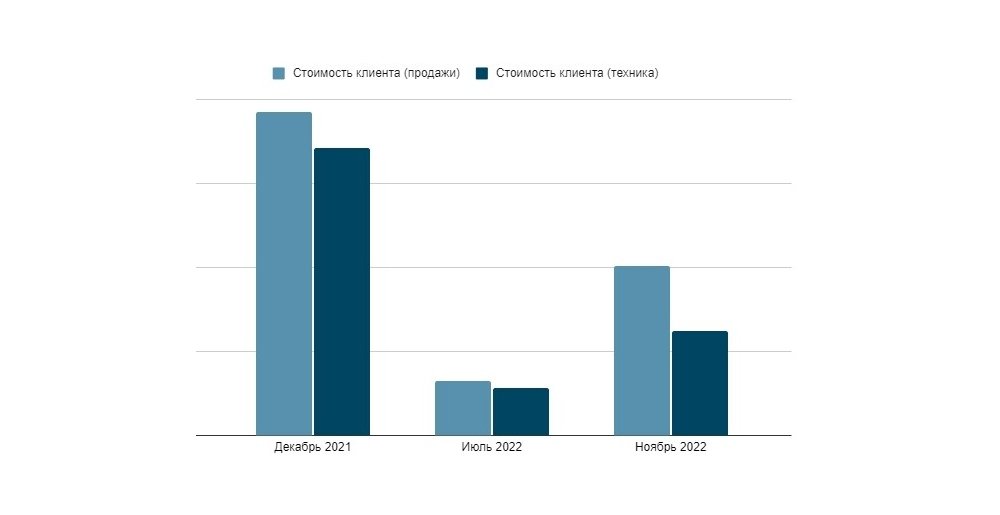 Для сравнения мы специально взяли традиционно хорошие и плохие, с точки зрения спроса на климатическую технику, месяцы. Даже в ноябре основные показатели клиента (кол-во продаж, стоимость продажи) улучшились по сравнению с декабрем прошлого года.