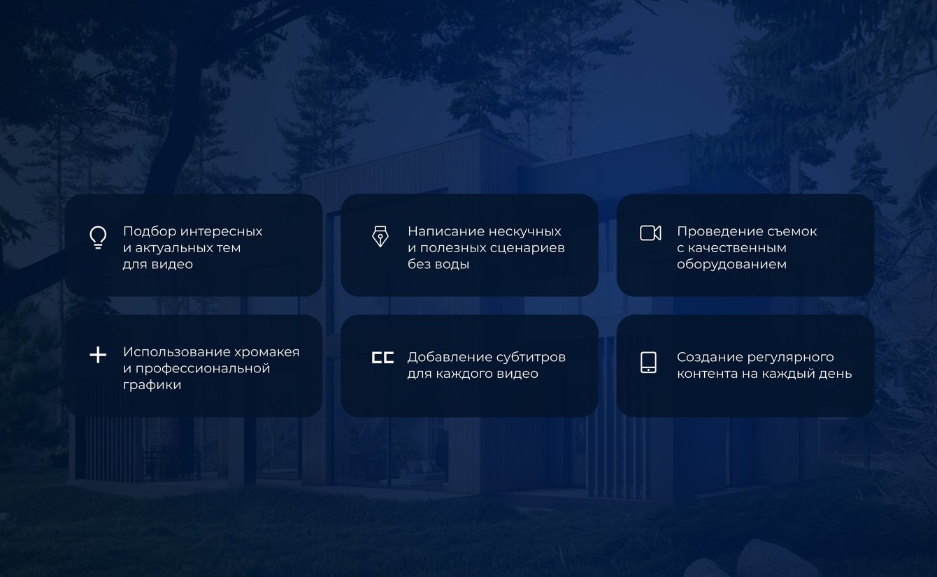 Создание коротких вертикальных видеороликов до 1 минуты для соцсетей (YouTube Shorts, Instagram Reels, ВК Клипов, Яндекс Дзена) и их публикация каждый день. Через видеоролики мы познакомим аудиторию с компанией и командой; подробно покажем все процессы строительства прямо на стройке; расскажем про проекты домов и их планировки; предоставим цены и сметы; а также объясним расчеты по ипотеке; даже покажем косяки и как их исправить, ведь косяков на стройке не может не быть.