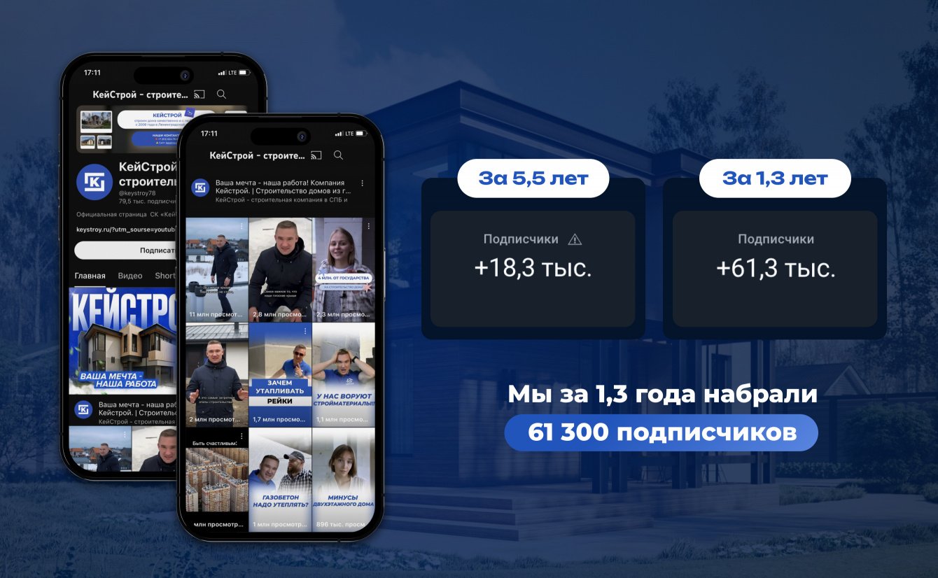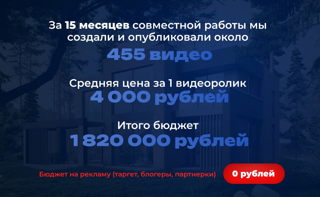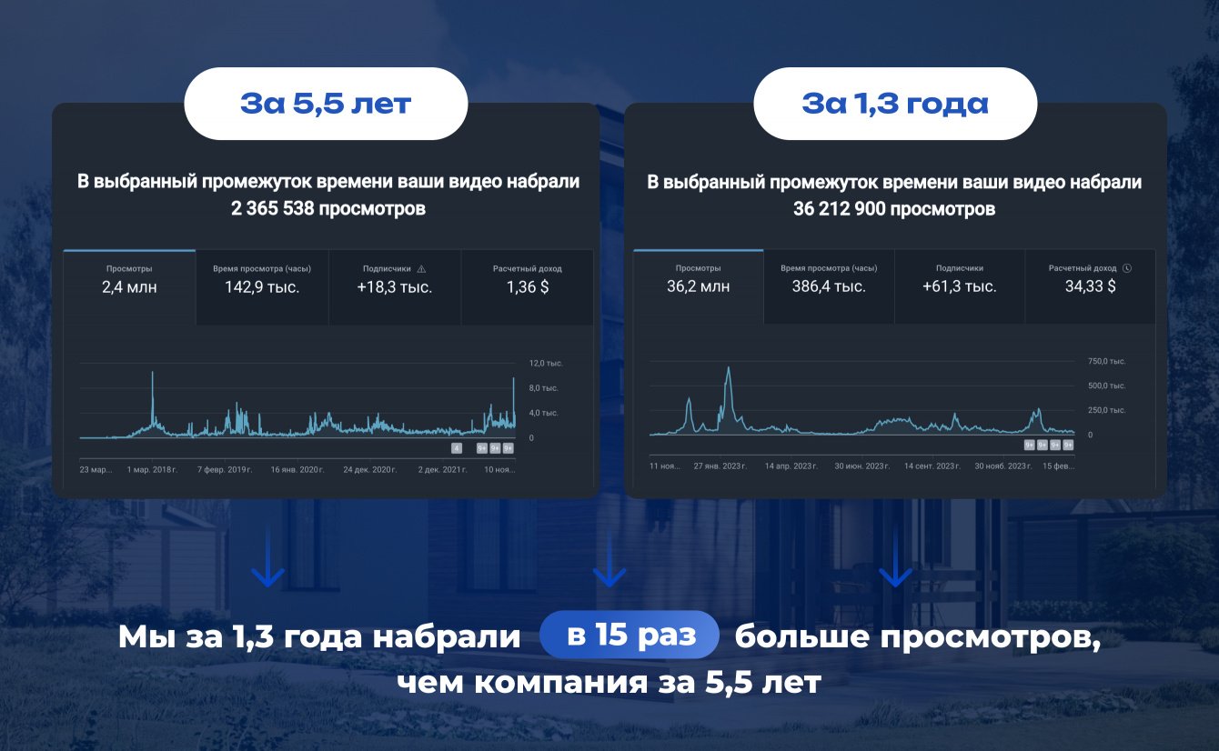 Сотрудничать с такой командой, большое удовольствие. За год плодотворной работы по созданию видео контента, наш Ютуб канал вырос с 15 тыс. подписчиков до 80 тыс. А за 2023 год, с видеороликов мы получили 27 заказов на строительство домов обшей стоимостью более 300 млн.