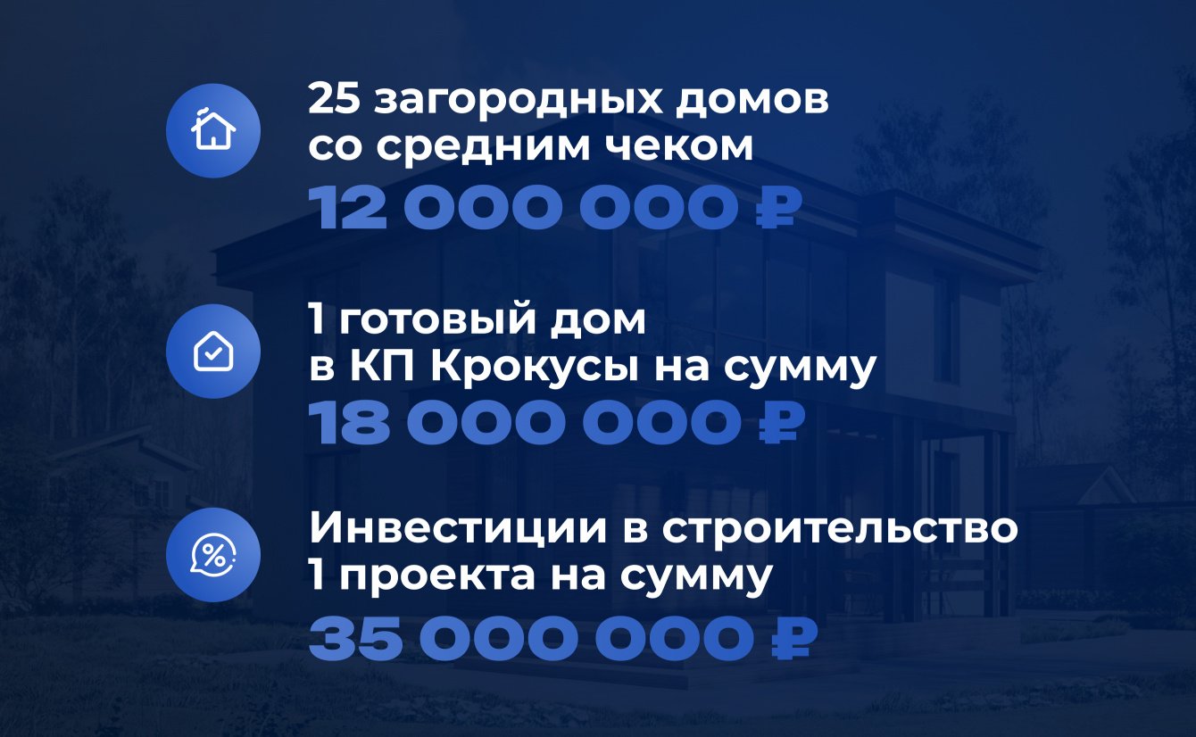 - Продажа 25 домов со средним чеком на сумму 12 000 000 рублей;