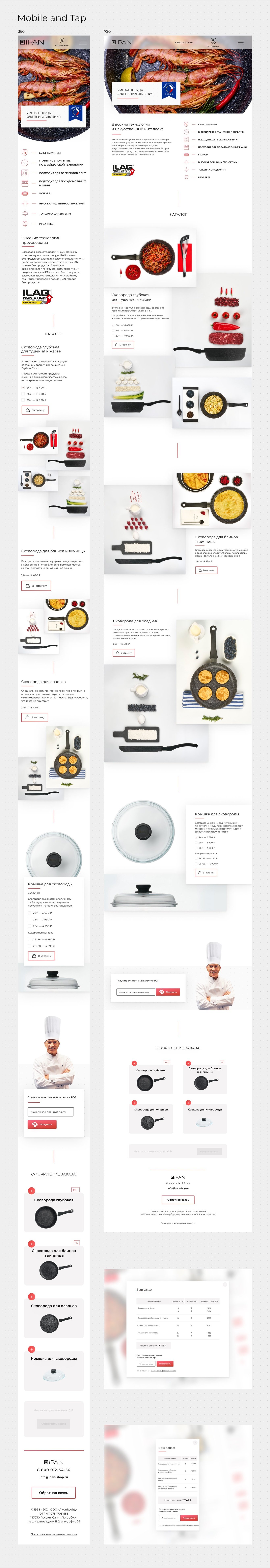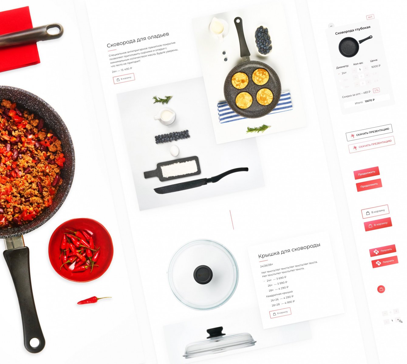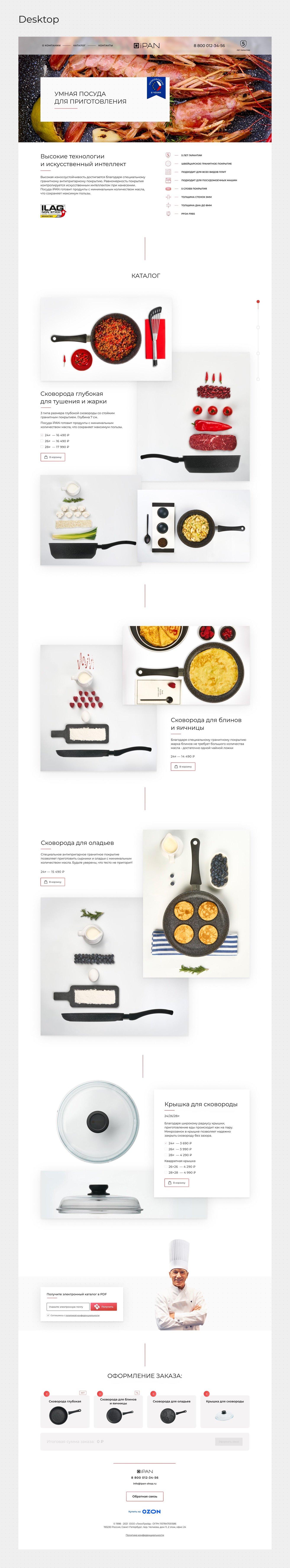 Сайт - каталог с обилием фотографий продукции. Сковородку можно выбрать во время пролистывания каталога или внизу страницы из карточки продукта. В карточке присутствует возможность выбрать вид сковороды, диаметр и количество.