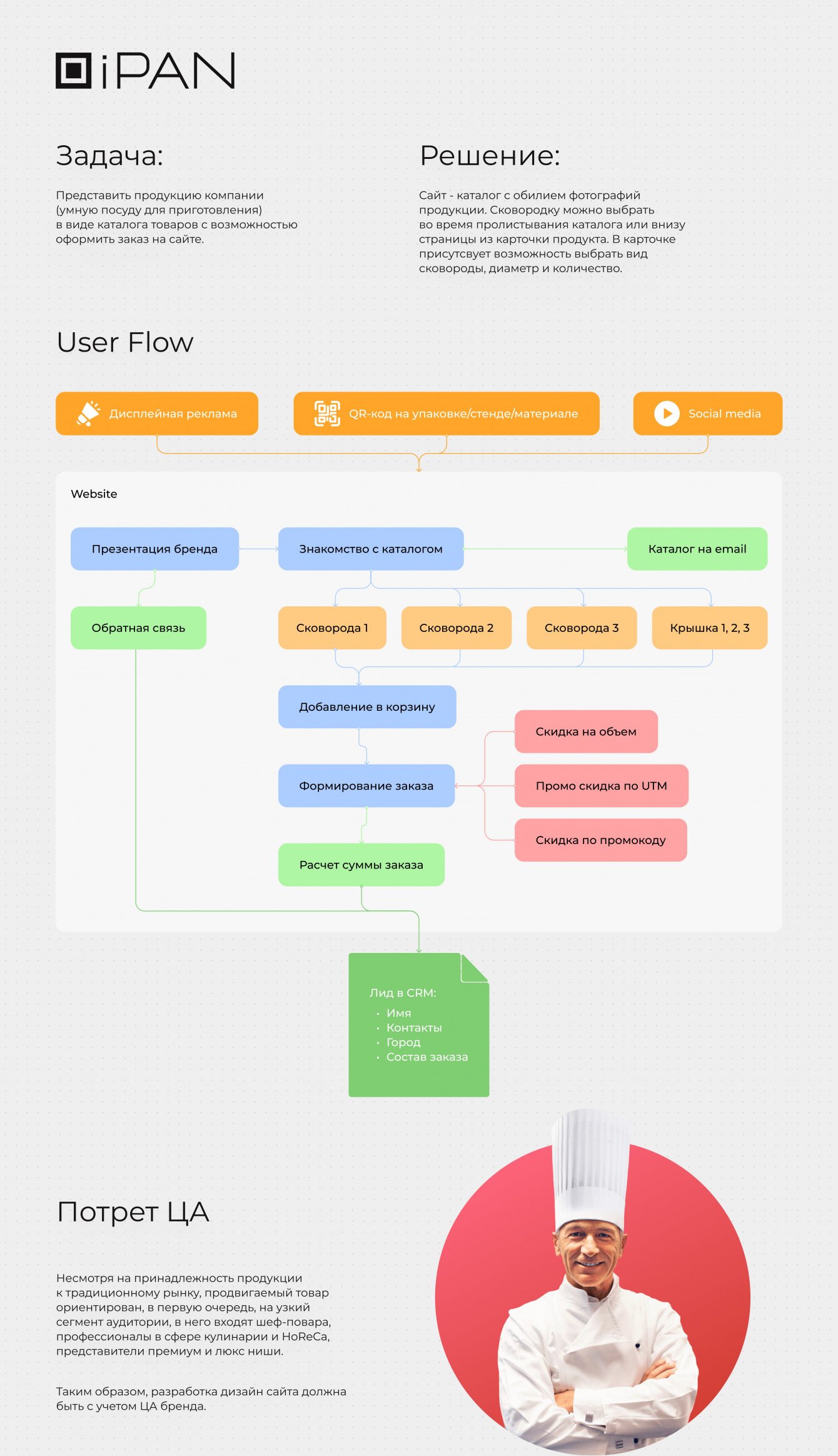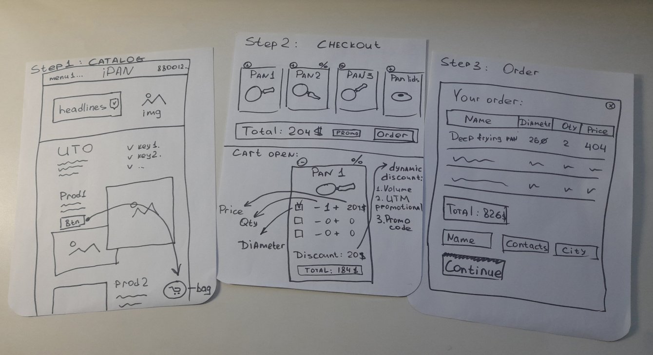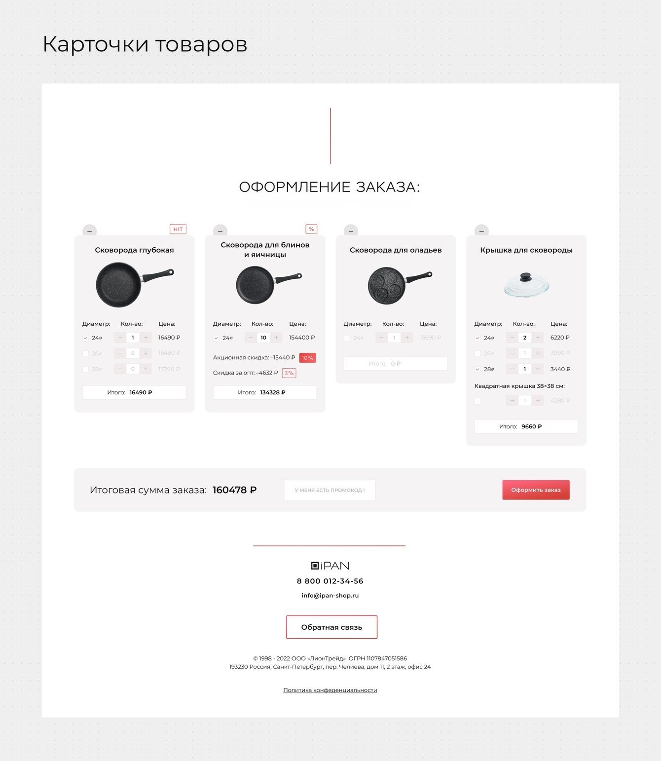 Сайт - каталог с обилием фотографий продукции. Сковородку можно выбрать во время пролистывания каталога или внизу страницы из карточки продукта. В карточке присутствует возможность выбрать вид сковороды, диаметр и количество.