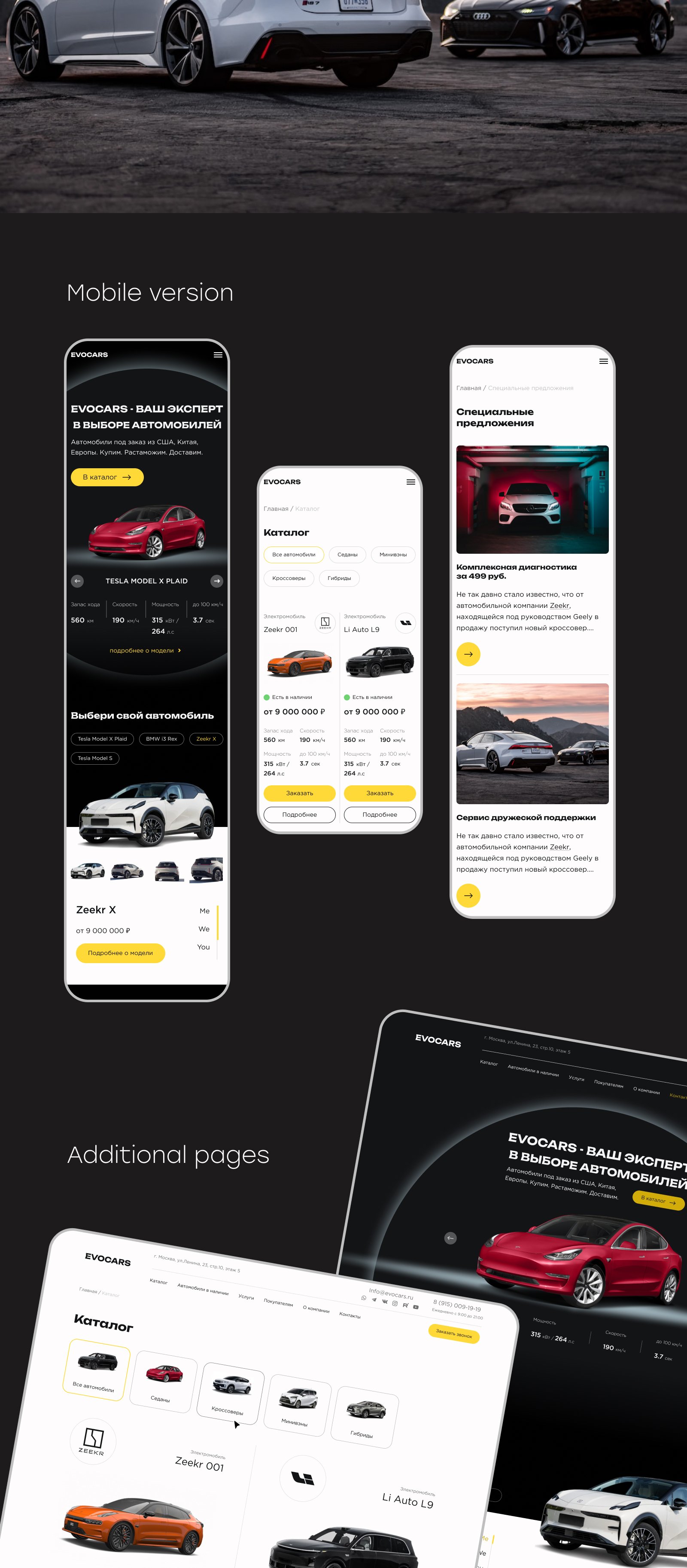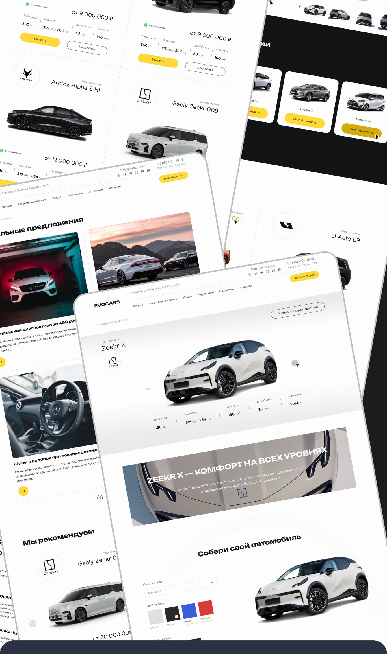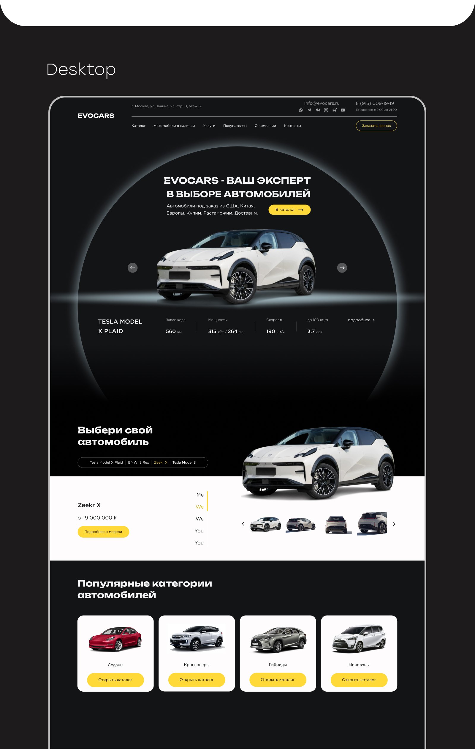 Мы справились с этой нестандартной задачей, применив оригинальный подход и разделив ответственность между дизайнерами. Техническая реализация: Уникальный дизайн: Чтобы гарантированно уйти от копирования собственного же референса, мы передали задачу другому дизайнеру в команде. Это позволило получить свежий взгляд и абсолютно новую концепцию. В итоге сайт получился полностью отличным от референса, но при этом мы не потеряли ни одной функциональной возможности. Визуальный стиль: Использовали технологичную и динамичную цветовую гамму (темный фон #131416, яркий акцентный желтый #FFD938, белый) и шрифты Gotham Pro и Unbounded, что создает ощущение современности и премиальности. Система конфигурации автомобилей: Разработали ключевой функционал — возможность для пользователей собирать собственную конфигурацию автомобиля, выбирая опции и видя итоговую цену. Это мощный инструмент, приближающий посетителей к покупке. Анимация и UX: Согласовали с заказчиком и реализовали продуманную анимацию, которая делает интерфейс живым и современным, не перегружая его. Верстка и платформа: Подготовили адаптивную верстку и настроили систему управления (вероятно, WordPress или Opencart) для дальнейшей интеграции и управления контентом.