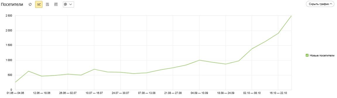 Количество новых посетителей увеличилось в 9,5 раз, что показывает график по неделям: