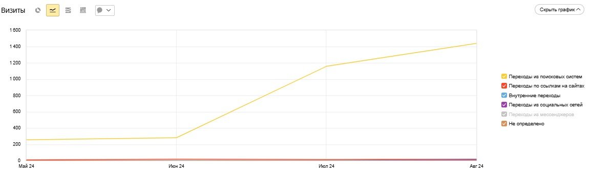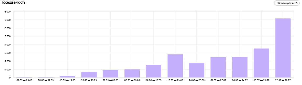 Этот график по неделям показывает количество посещаемости сайта. Она увеличилась с 39 до 7125 визитов
