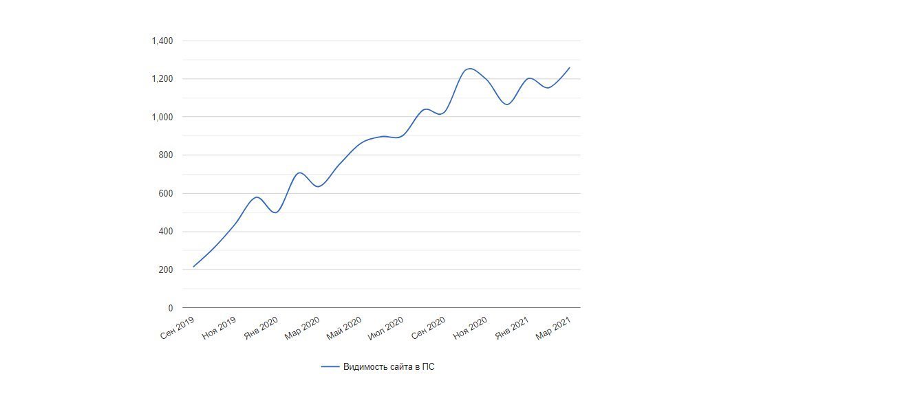 За счет оптимизации кода и верной настройки индексирования (с помощью robots.txt), удалось уже в первый месяц увеличить количество страниц в поиске и сделать сайт видимым в выдаче. За 12 месяцев поисковой трафик увеличился до 1260 посетителей