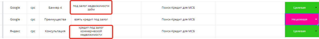 Чтобы снизить стоимость заявки, мы проанализировали результаты теста и выяснили, что все целевые заявки были получены по ключевым запросам, которые включают в себя словосочетание "залог недвижимости". Мы разделили семантику на 2 группы, с "залог недвижимости" и без, и запустили в А/В тест.