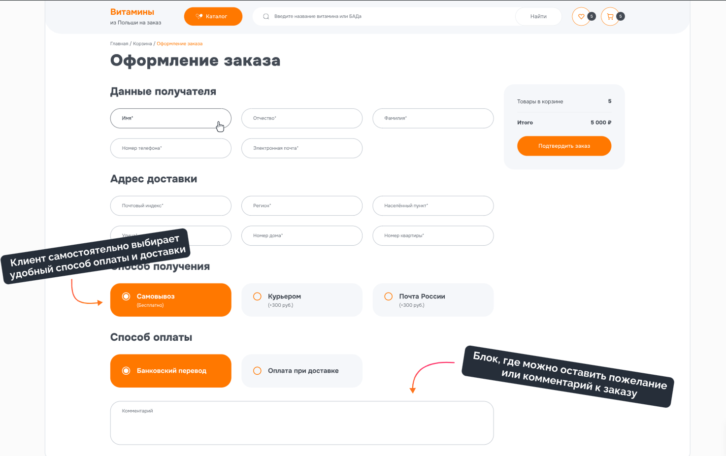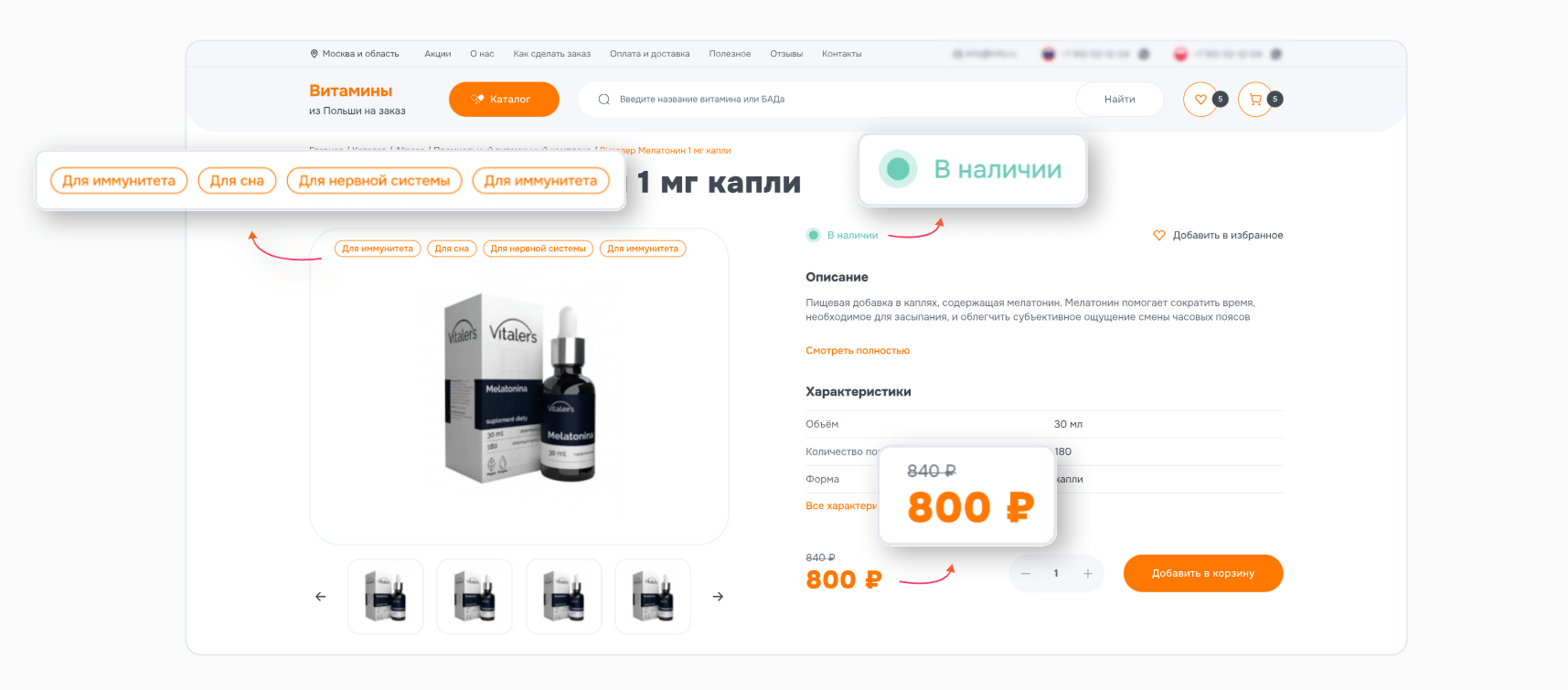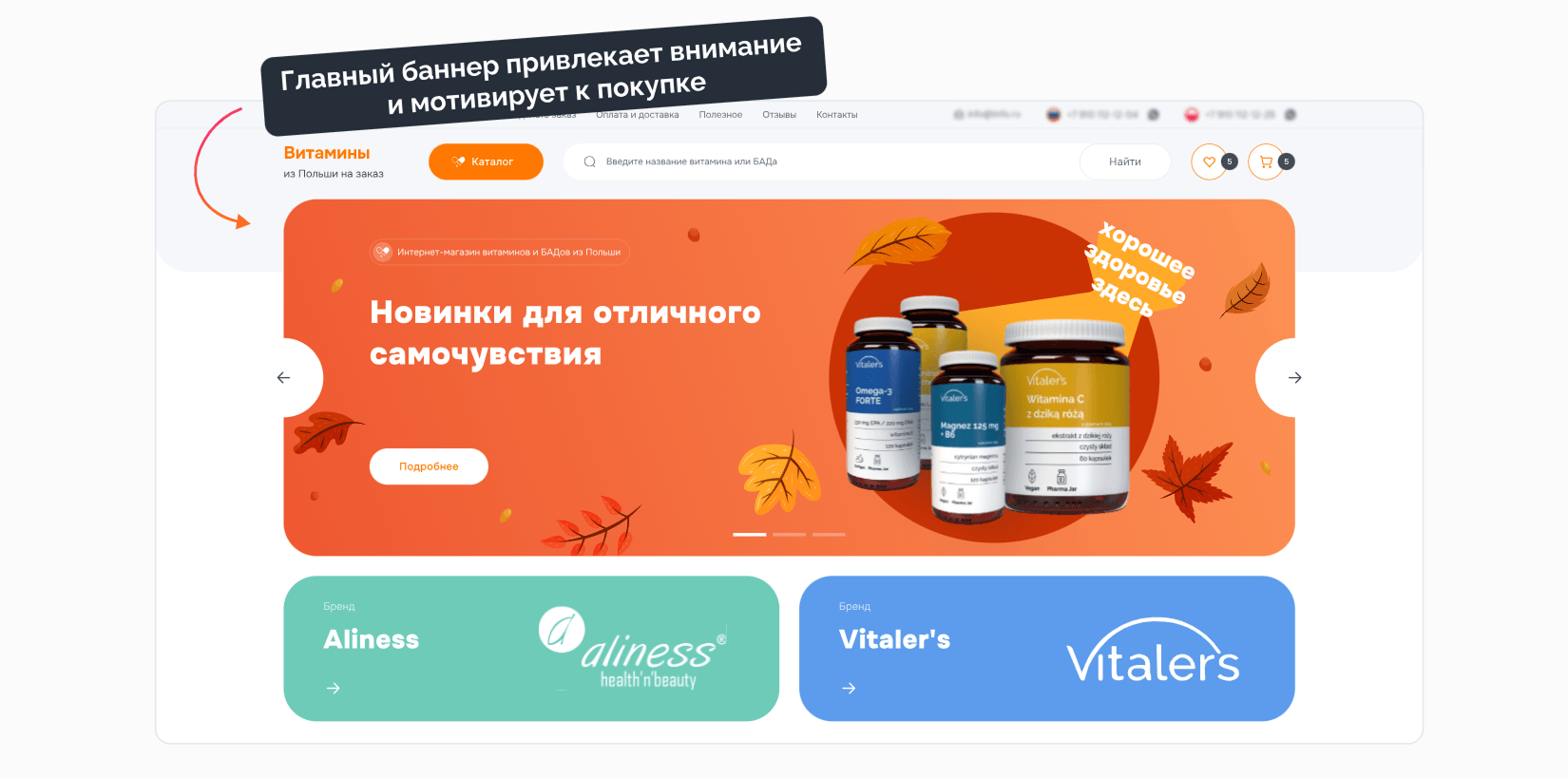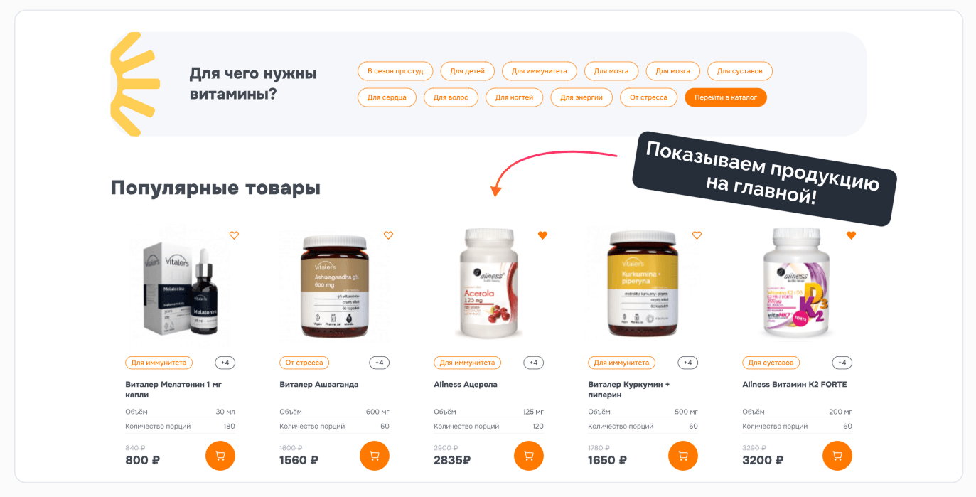 Наш клиент занимается поставками польских витаминов и БАДов на российский рынок. Для успешного продвижения продукции заказчику со временем потребовался интернет-магазин, и он обратился к нам за разработкой. С самого начала нас ждали несколько серьёзных вызовов: