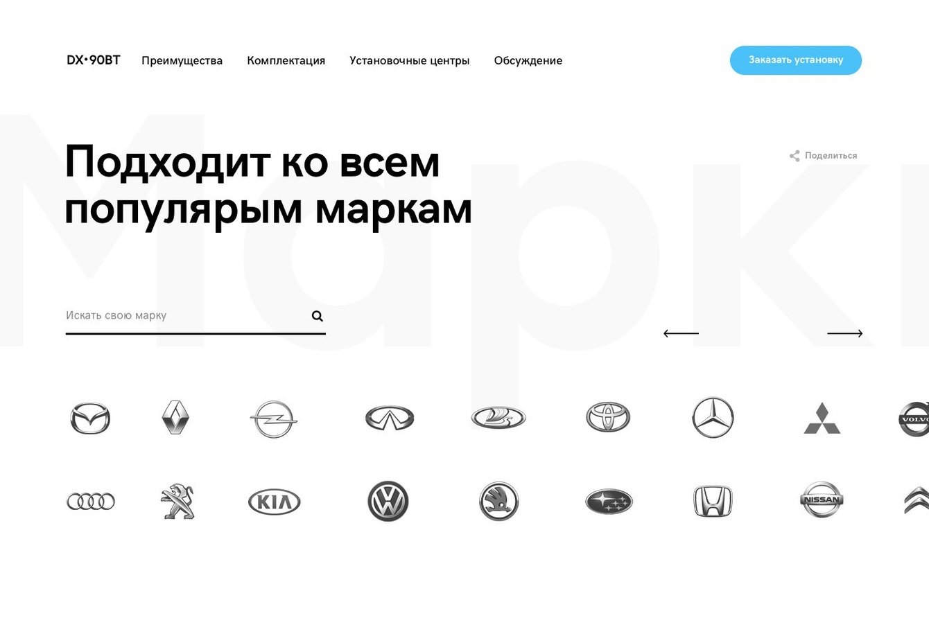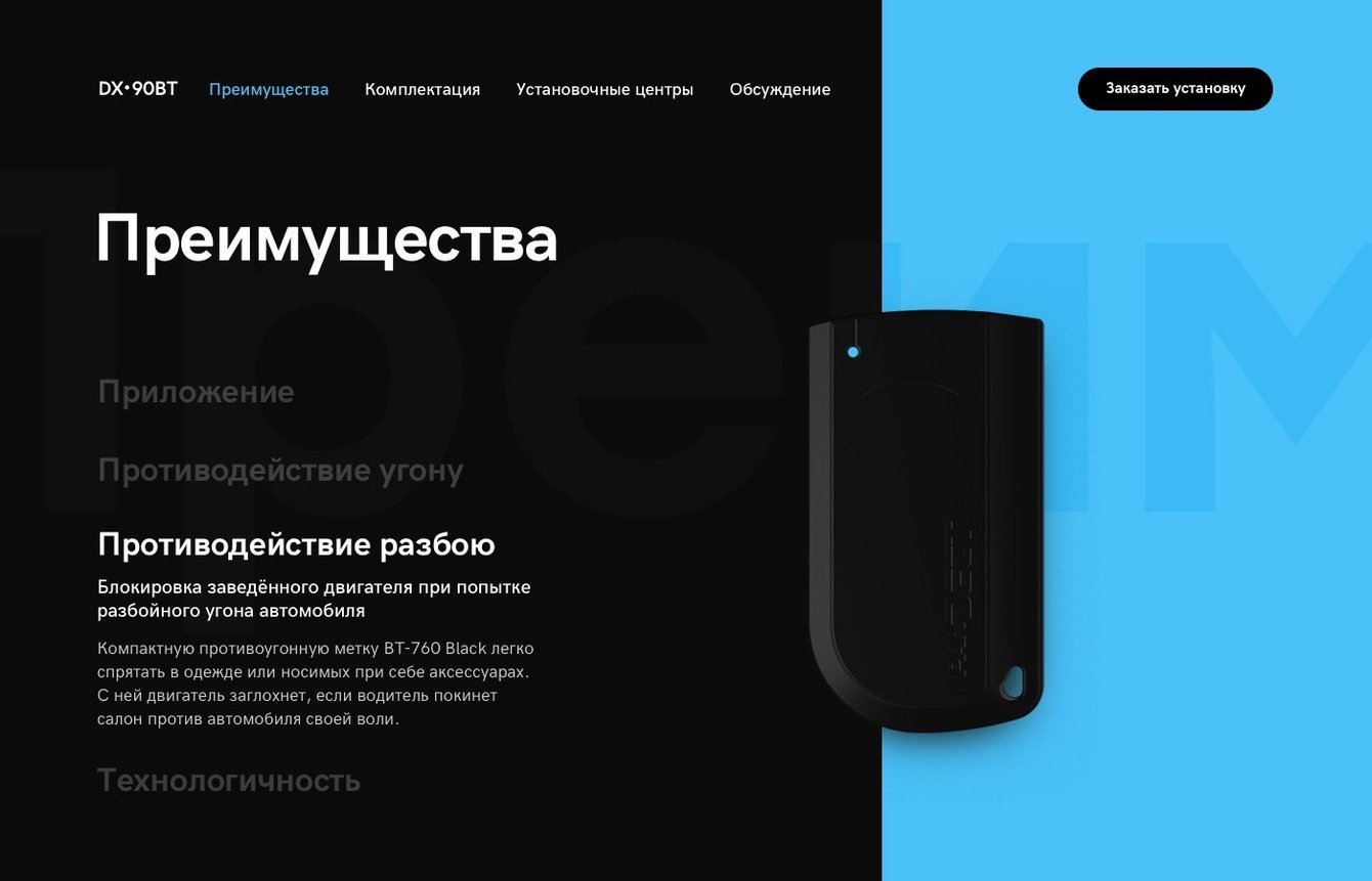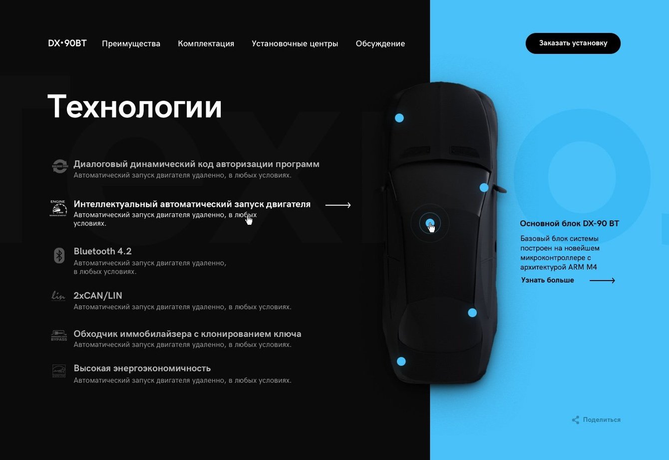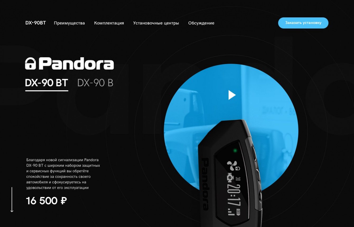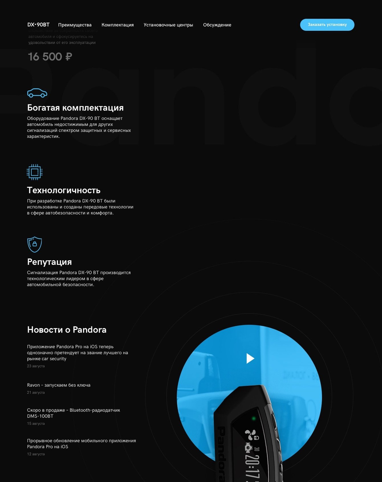 Мы спроектировали ключевые экраны, которые были призваны наиболее полно и ёмко донести преимущества Pandora DX 90BT: видеоролик — технологии — преимущества — совместимость с авто — комплектация и технические характеристики — дополнительное оборудование.