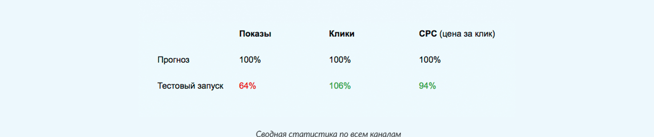 По итогам тестовой рекламной кампании нам удалось достигнуть запланированных показателей по количеству кликов, получилось снизить стоимость перехода, но мы значительно просели по количеству показов.