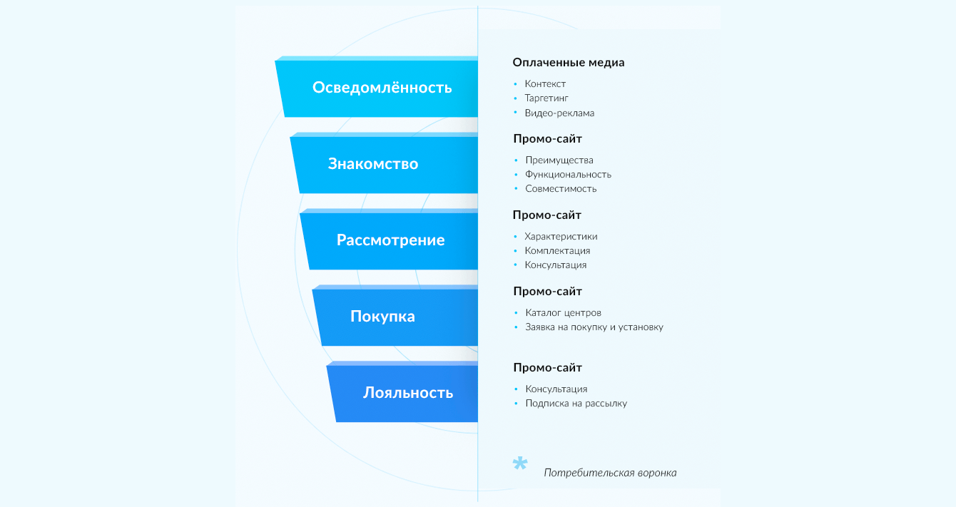 Затем мы составили потребительскую воронку и сформировали пул рекламных инструментов для эффективного взаимодействия с аудиторией на каждом из доступных нам этапах потребительской воронки.