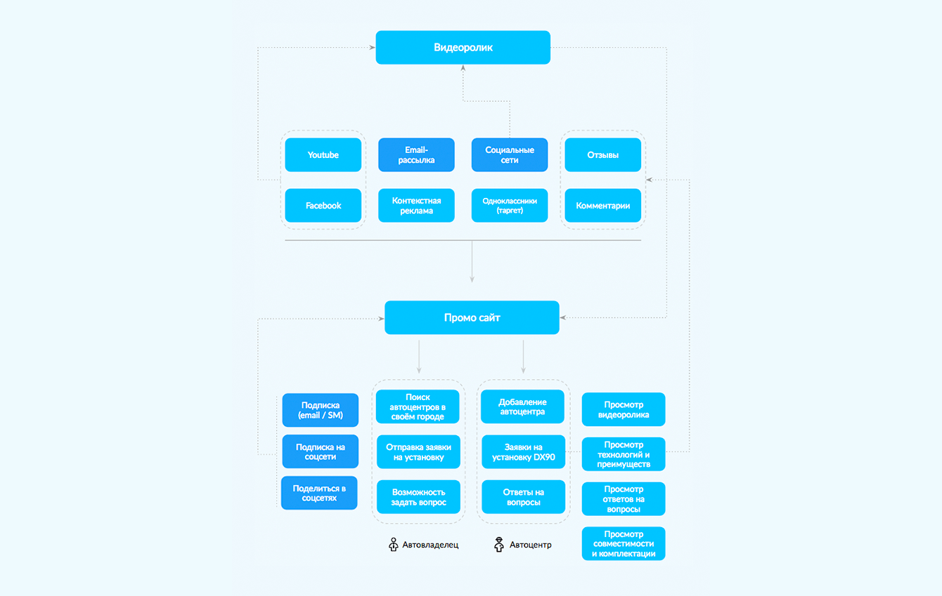 Составив пул рекламных площадок, о которых мы расскажем в разделе «реализация», мы разработали архитектуру коммуникаций: