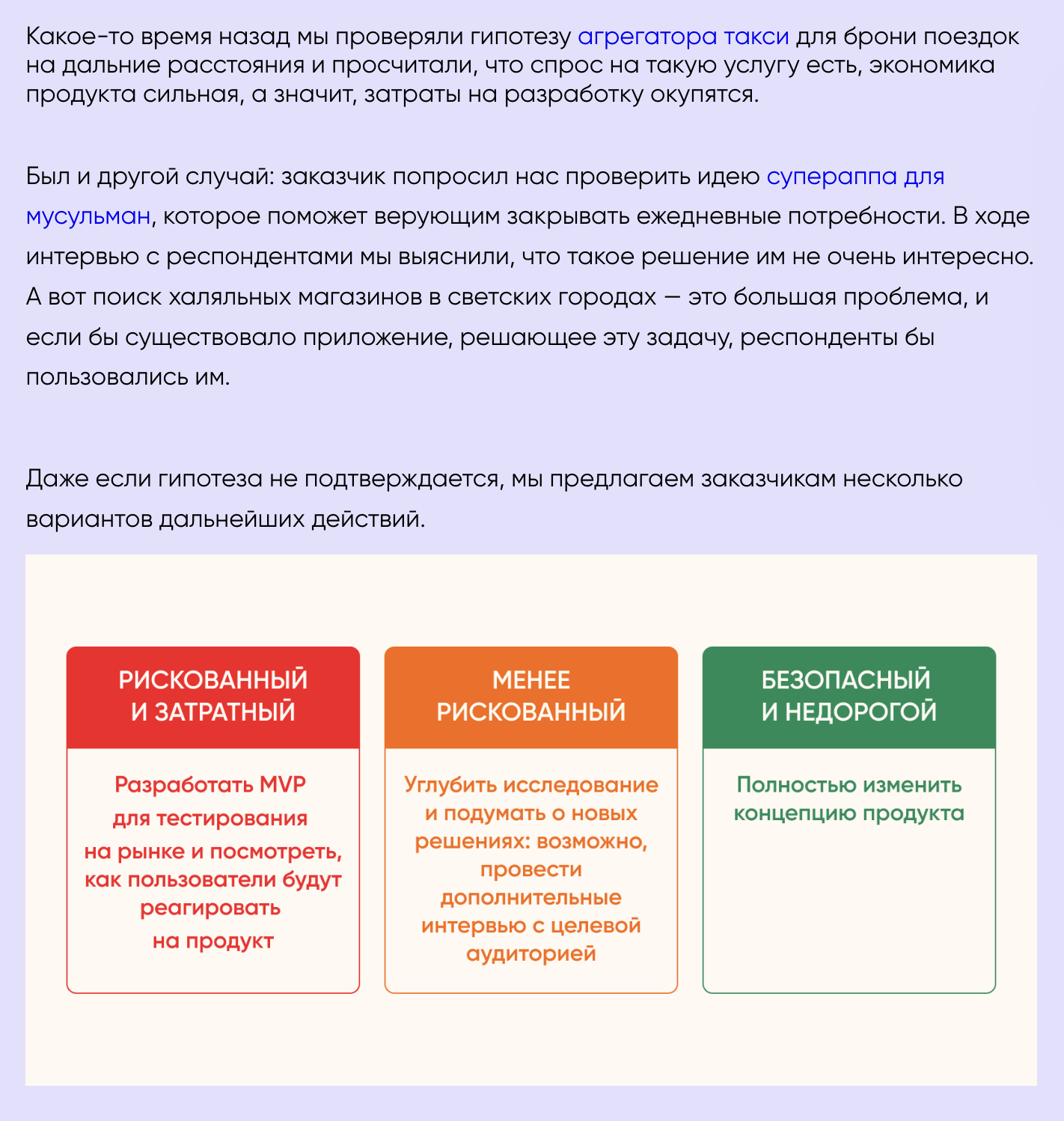 Product discovery позволяет минимизировать риски: мы или подтвердим, что сегмент есть и концепция продукта для него актуальна, либо получим инсайты, которые помогут скорректировать концепцию.