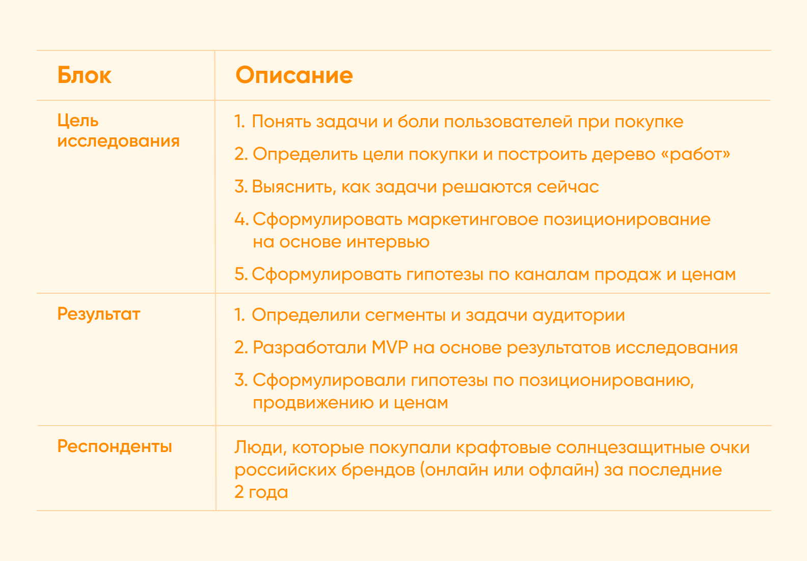 Мы провели 20 интервью по методике «Jobs to be Done», чтобы понять, для каких задач респонденты «нанимают» текущие решения — магазины крафтовых солнцезащитных очков, а также выявить проблемы и неудобства пользователей.