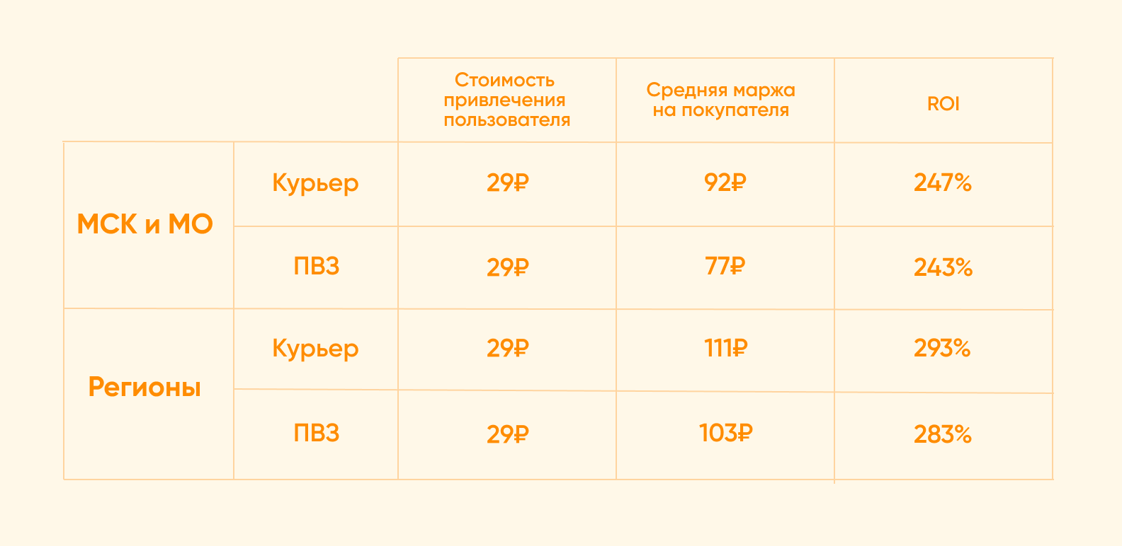 Получается, что обе модели монетизации эффективны — доход с пользователей превышает расходы. Расчет также подтвердил нашу гипотезу: фокус на покупателях из регионов позволит не просто успешно конкурировать с офлайн-решениями, но и принесет маркетплейсу больше прибыли.