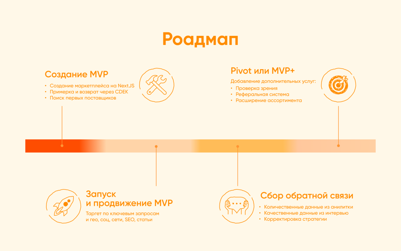 Сразу обсудили варианты пивота. Например, переключиться на рынок дизайнерских вещей, добавить возможность при покупке онлайн забрать заказ из удобного офлайн-магазина партнерской сети, добавить возможность кастомизации для покупателей и создания своих дизайнов.