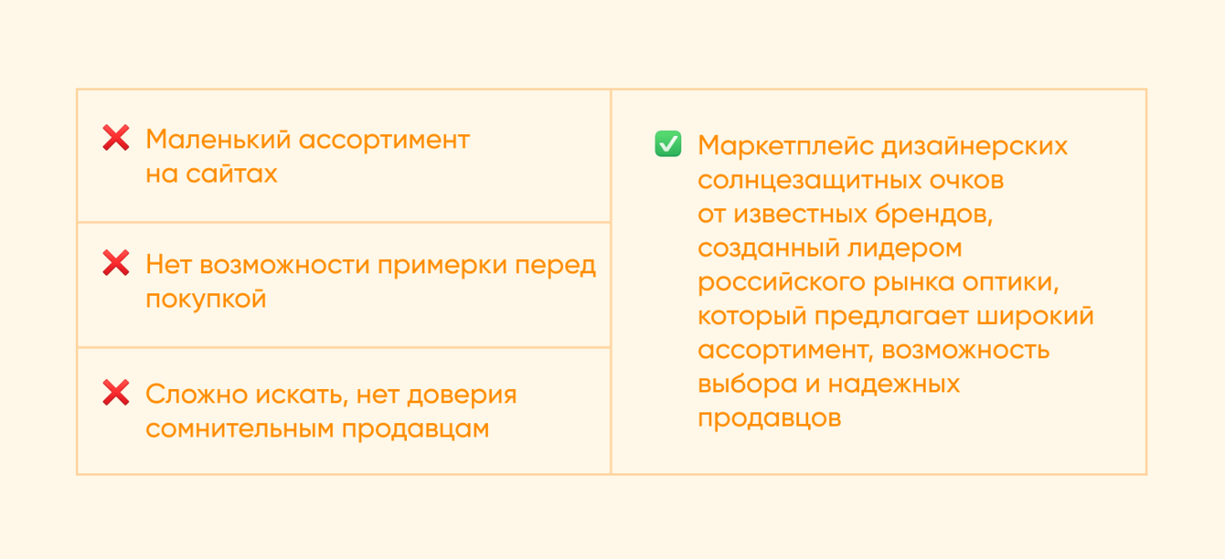Глобально задача выглядела так: мы должны были подтвердить, что сегмент покупателей крафтовых солнцезащитных очков достаточно большой и платежеспособный для устойчивой экономики маркетплейса. Также нам предстояло собрать инсайты: что не устраивает в текущих решениях, чтобы мы могли добавить именно те функции, которых не хватает пользователям.