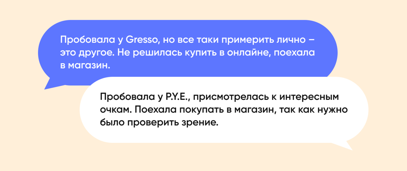 Практически все респонденты указывали, что для них важна примерка: можно проверить удобство, тактильный комфорт, подходит ли форма очков. И функция онлайн-примерки, которая есть на некоторых сайтах, для многих выглядит костыльным решением.