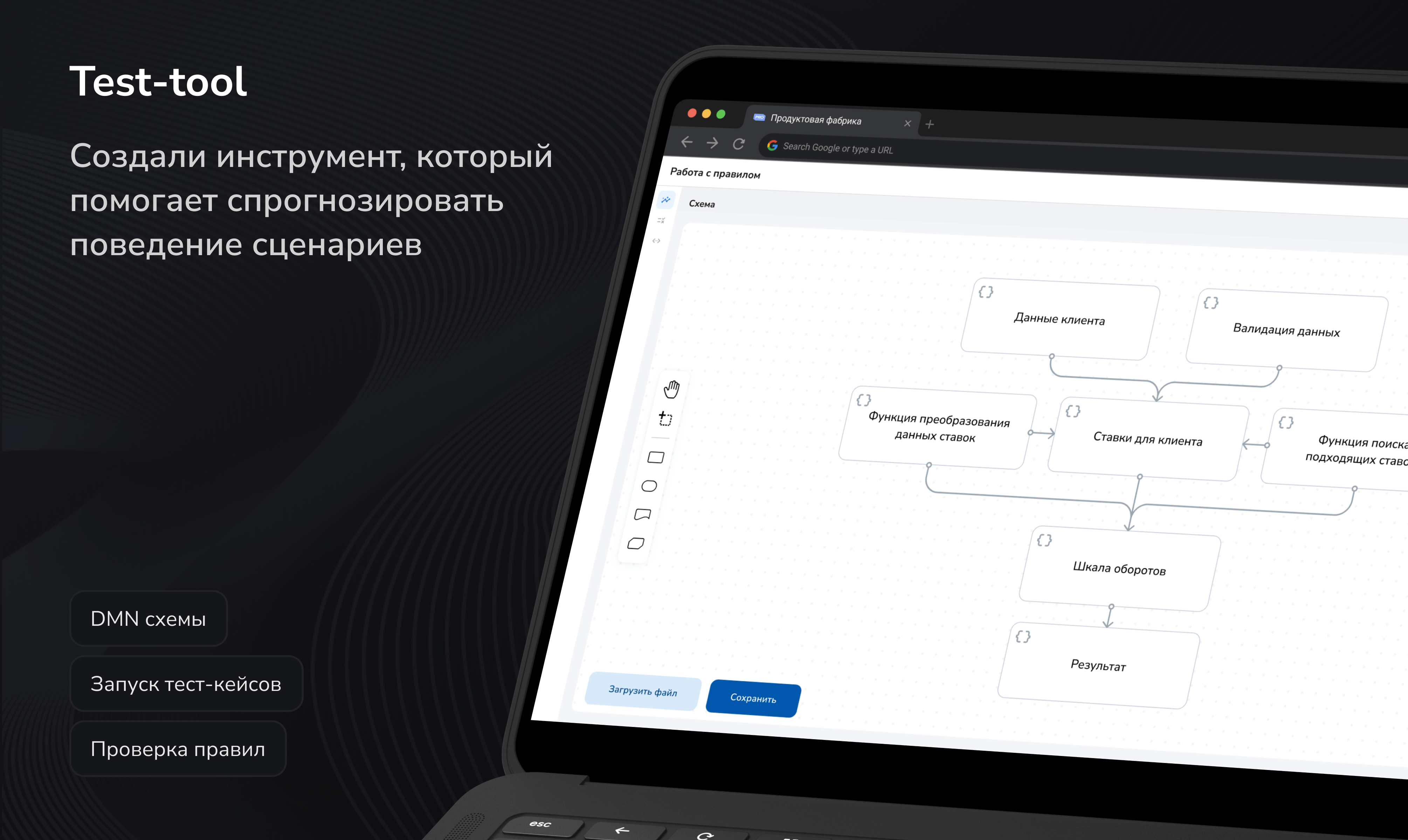 Правило описывается на языке FEEL и включает входные данные, логику обработки и выходные значения. Test-tool позволяет быстро проверить правило на конкретном наборе входных данных без сохранения сценария, а при необходимости — создать и сохранить тест-кейсы для повторного использования. В каждом тест-кейсе задаются входные параметры и ожидаемый результат, после чего система выполняет правило, получает фактический результат и сравнивает его с ожидаемым.