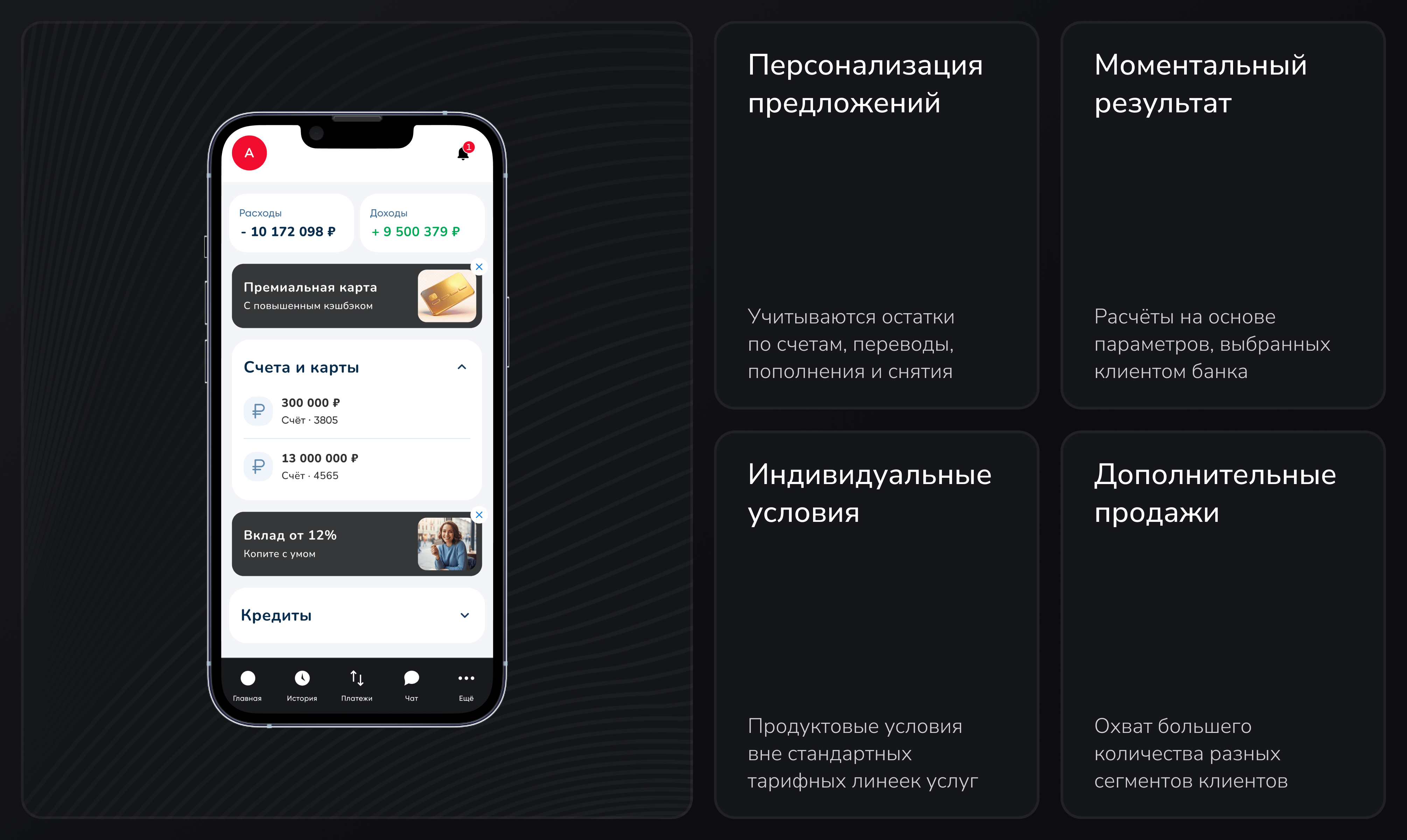 На стороне клиента это может выглядеть просто: в интерфейсе ДБО пользователь выбирает нужные параметры, двигает ползунки и сразу видит рассчитанный результат с учётом своего профиля — например, остатков, переводов, пополнений или снятий. Для банка это важная точка роста: можно предлагать более точные продуктовые условия клиентам с нестандартными запросами, которые не попадают в стандартную тарифную линейку, и тем самым увеличивать дополнительные продажи.