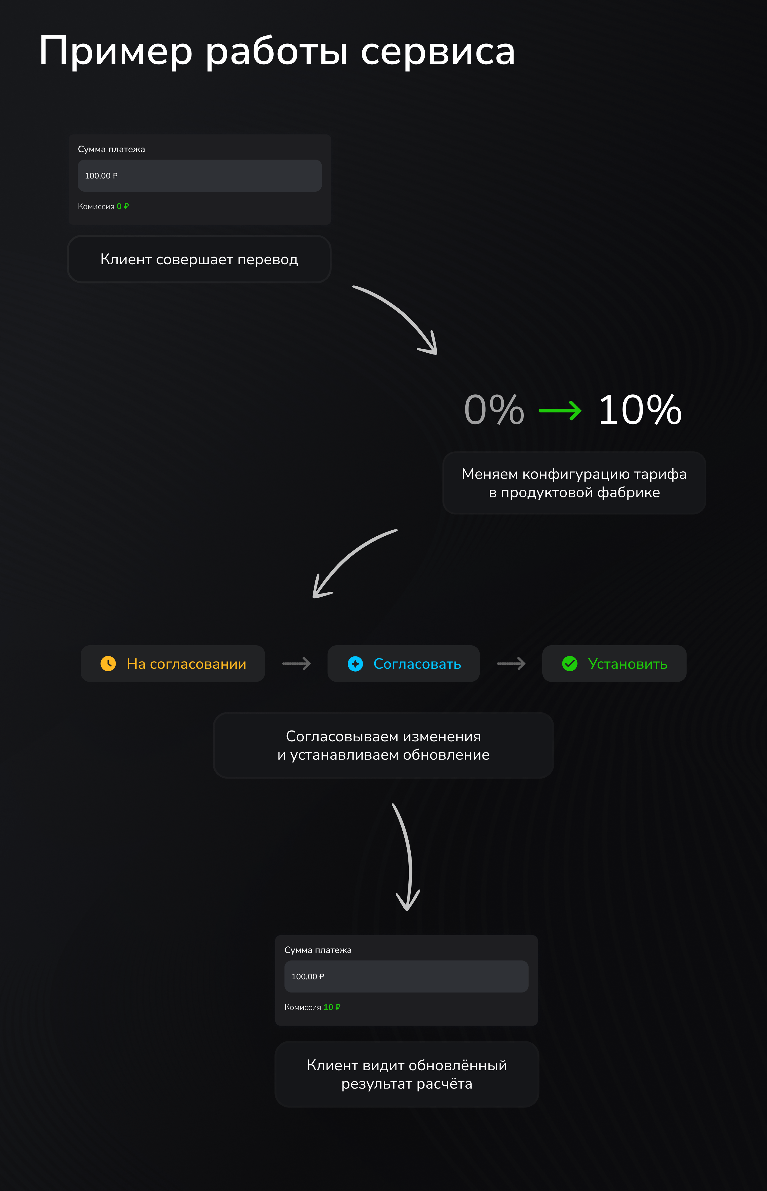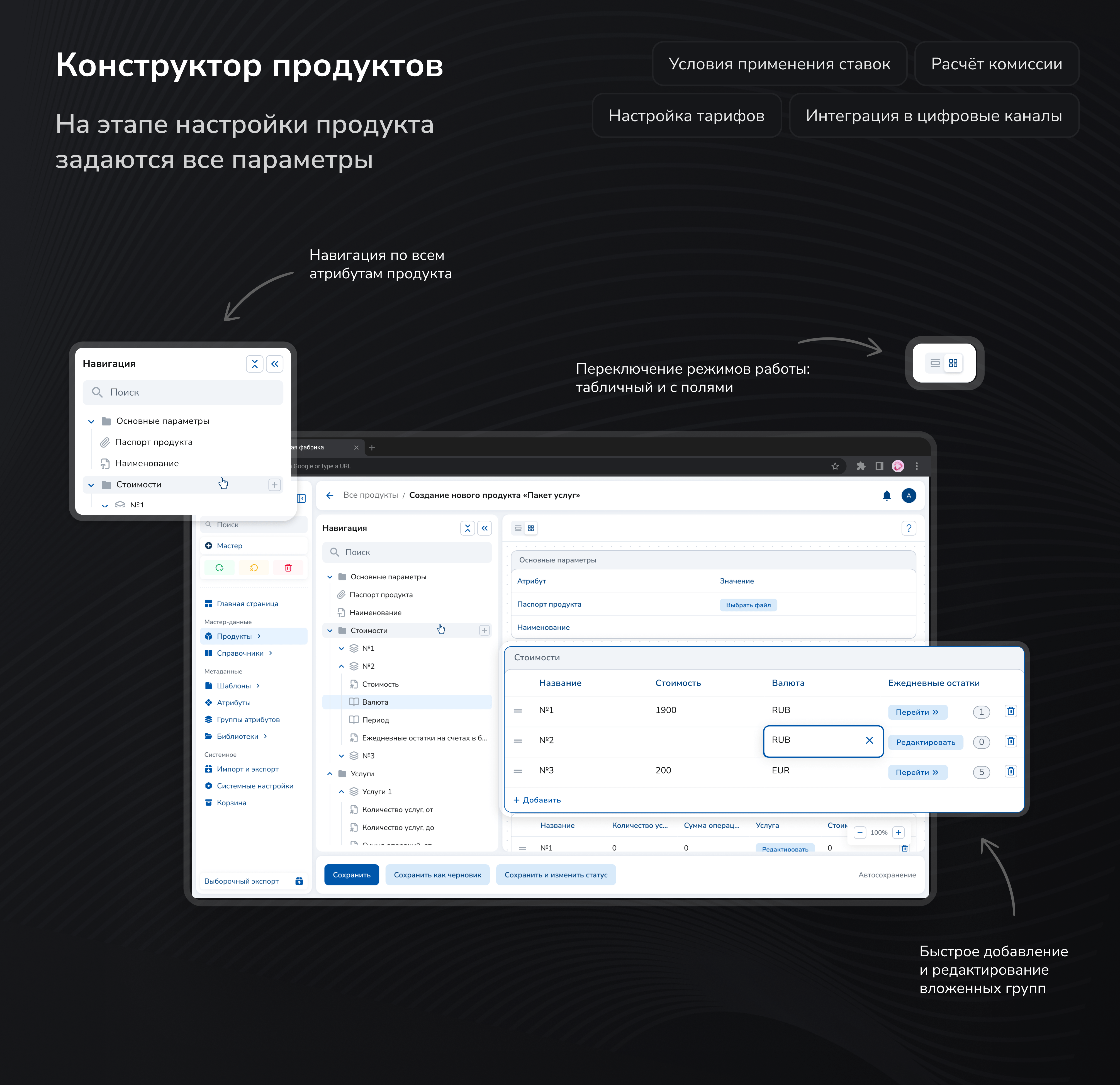 Через него можно завести атрибуты продукта, задать тарифы для разных сегментов клиентов, настроить условия по операциям и сразу передать эти значения во все подключенные каналы. Поэтому изменение комиссии или параметра продукта больше не требует цепочки доработок в нескольких системах.