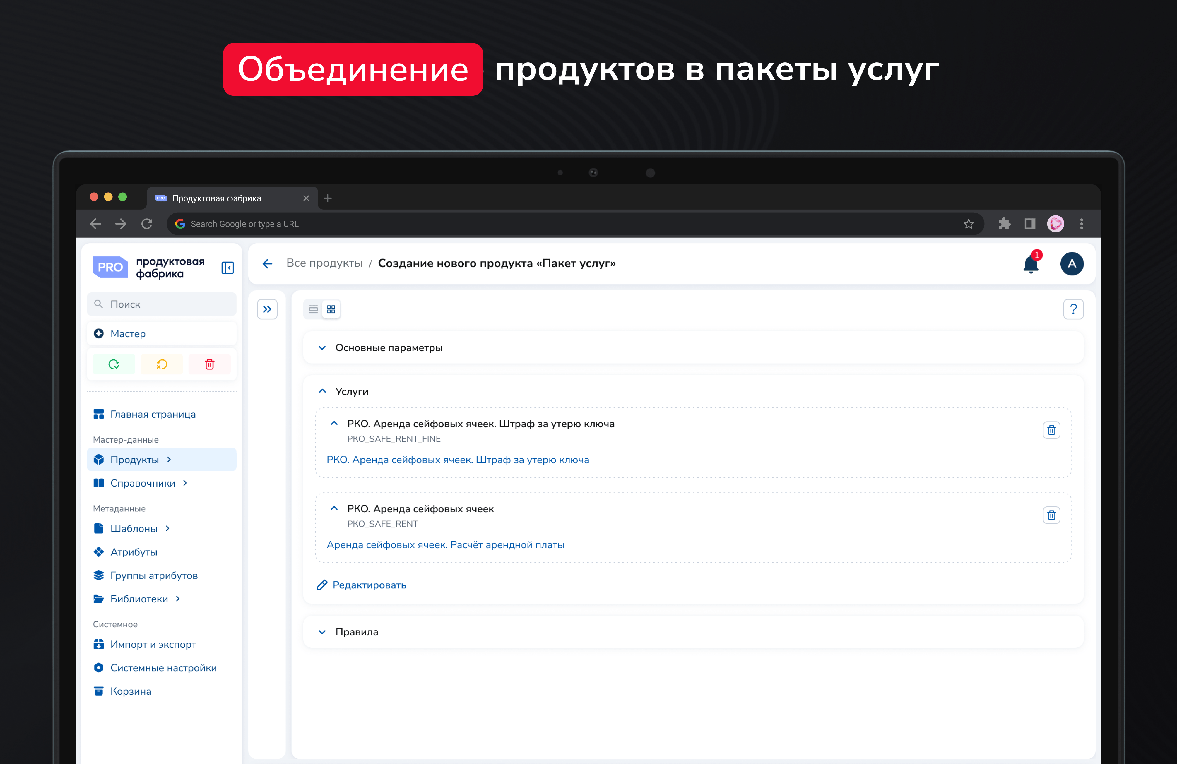 Продуктовая фабрика позволяет не только управлять стандартной линейкой, но и гибко кастомизировать продукты и услуги под конкретные запросы клиента. Для этого банк настраивает бизнес-правила, которые при разных входных параметрах определяют, какие продукты, тарифы и условия доступны клиенту и с какими свойствами. Здесь работают сразу несколько модулей платформы: конструктор задаёт логику продукта, витрина данных подтягивает профиль клиента и его атрибуты, а движок расчётов возвращает готовый результат. Банк может объединять разные продукты в пакеты услуг для своих клиентов.