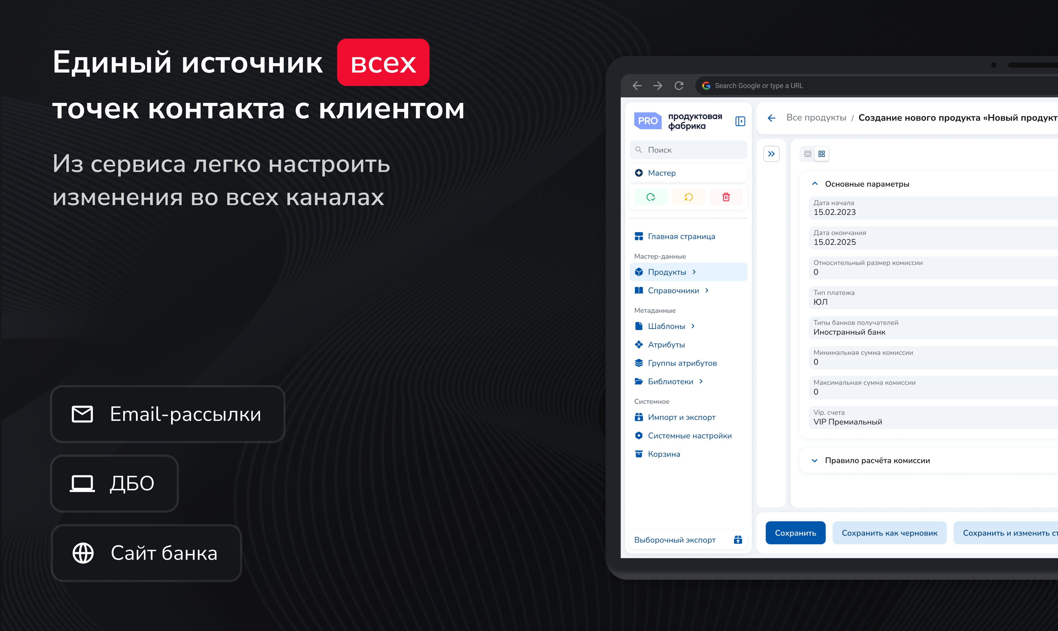 Продуктовая фабрика может выступать единым источником актуальных продуктовых условий для цифровых каналов банка — ДБО, мобильного приложения, сайта, единой фронт-офисной системы и других точек контакта с клиентом. Это логичное продолжение архитектуры платформы: параметры продукта задаются в конструкторе, затем передаются в подключенные системы, а изменения синхронно применяются во всех каналах.