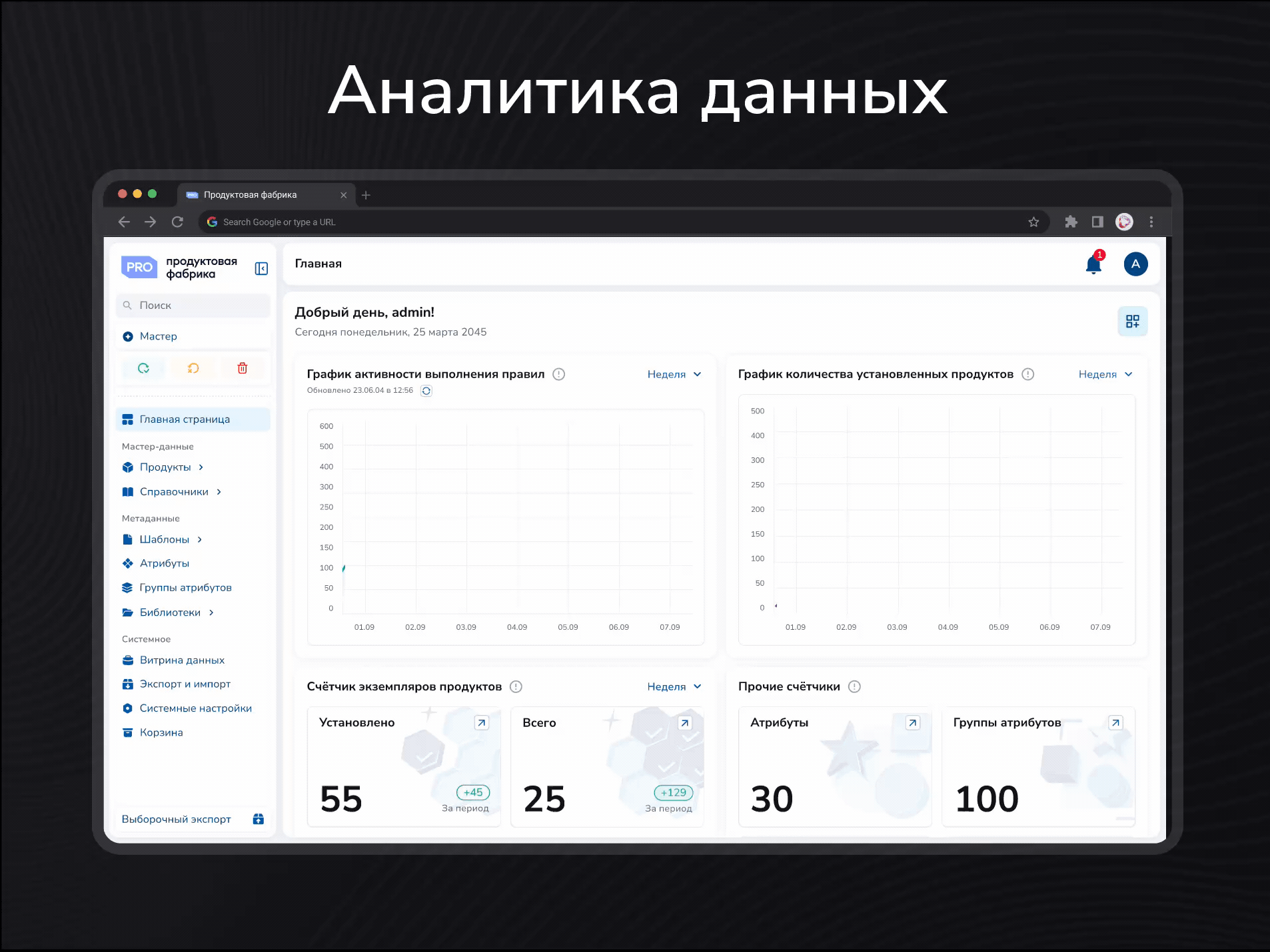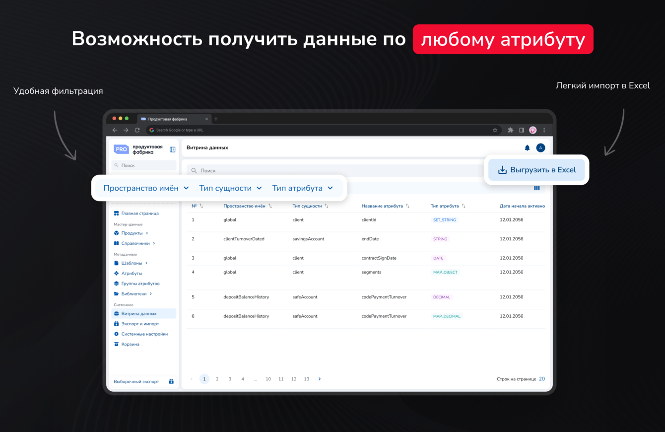 Витрина данных — модуль, который агрегирует информацию о клиентах, счетах, остатках, сегментах, продуктах и оборотах из разных систем банка. Это позволяет выполнять расчёты быстро и не обращаться каждый раз в десятки внешних систем за данными. Один раз настроенные данные дальше переиспользуются для новых продуктов и сценариев.