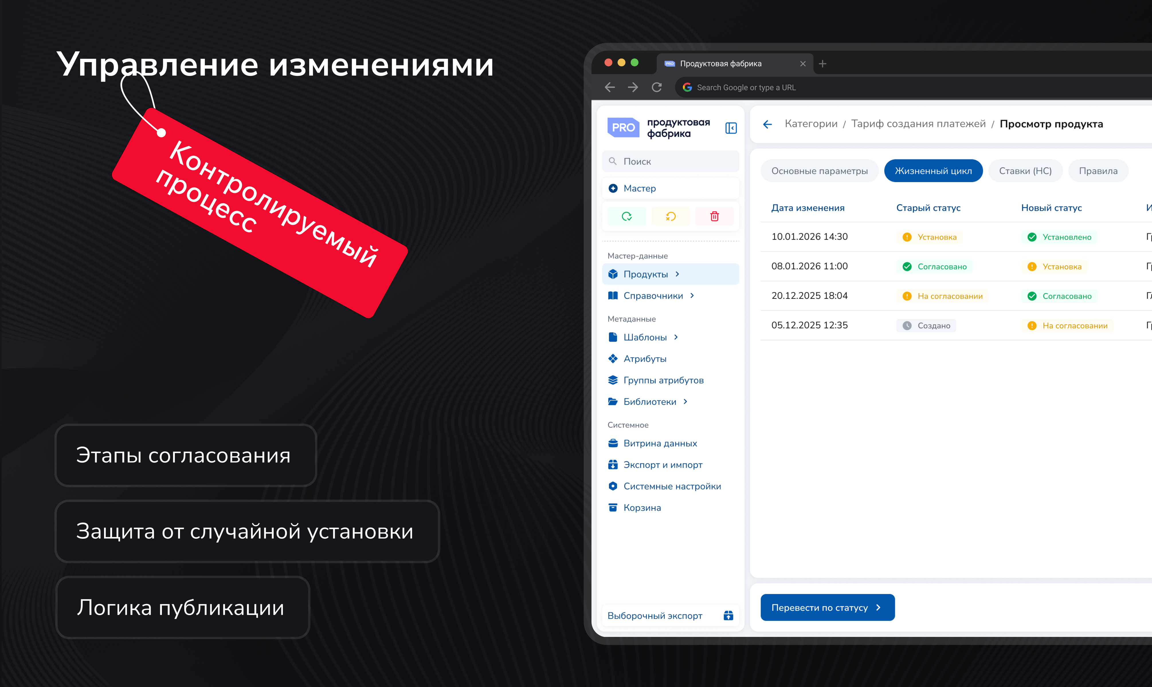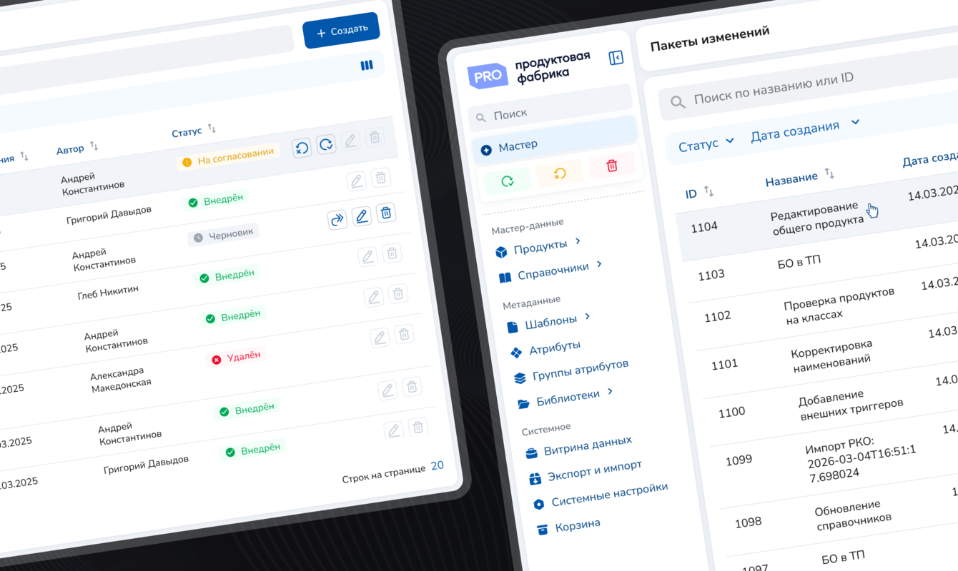 Интерфейс продумали простым и понятным для любого пользователя. Он позволяет управлять изменениями на любом этапе. В нём предусмотрены статусы, этапы согласования, логика публикации, защита от случайного вывода изменений в прод. Для банка это означает скорость изменений и их прозрачная управляемость: одно значение применяется синхронно во всех подключенных системах, и команда не тратит недели на ручную синхронизацию.