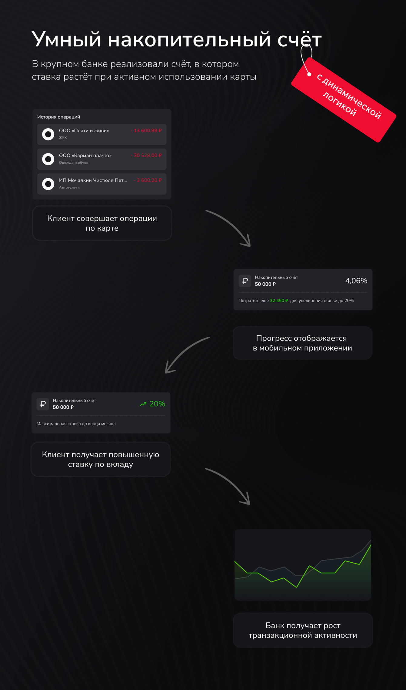 С помощью Продуктовой фабрики банк также внедрил умный накопительный счёт (НС), в котором выгода клиента напрямую зависит от его транзакционной активности. Банк реализовал механику, при которой клиент открывает счёт, совершает покупки по карте, а система пересчитывает его прогресс к повышенной ставке.