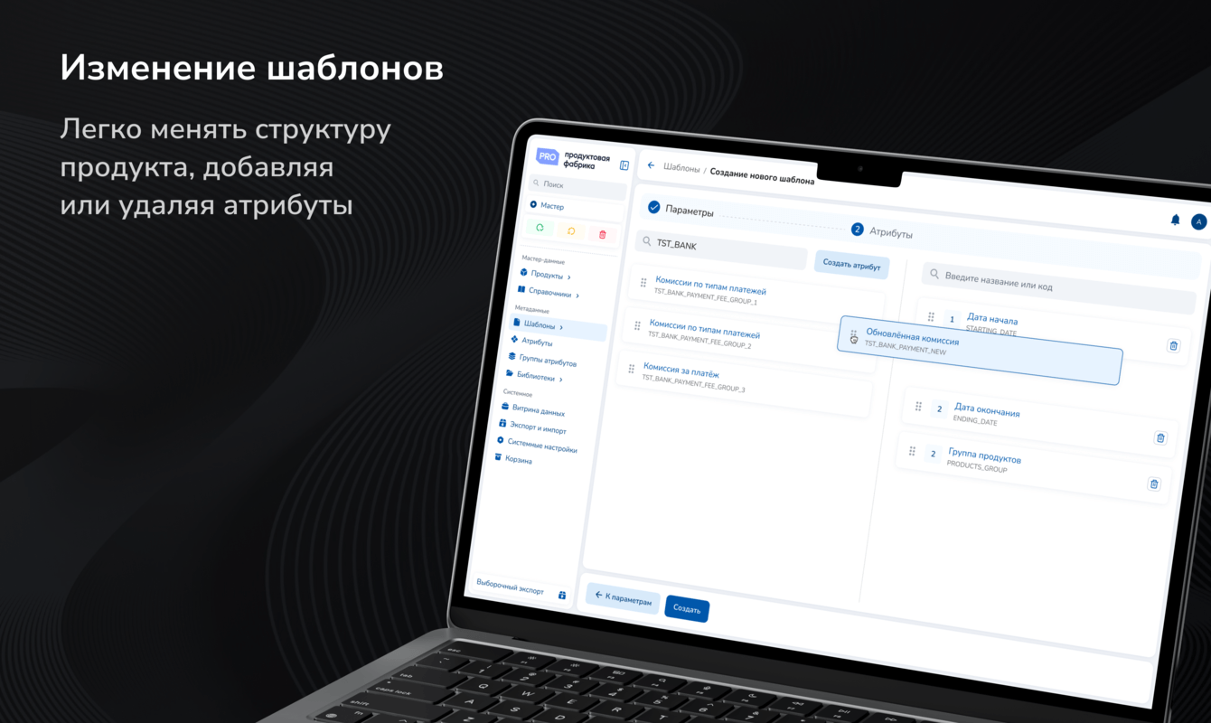 Внутри конструктора можно создавать и переиспользовать атрибуты, собирать их в группы, добавлять в шаблон продукта, а затем на основе шаблона создавать экземпляры с конкретными параметрами. В шаблон можно включать не только стандартные поля, но и атрибуты-правила, которые отвечают за расчётную логику, а также статусы для прохождения жизненного цикла продукта.