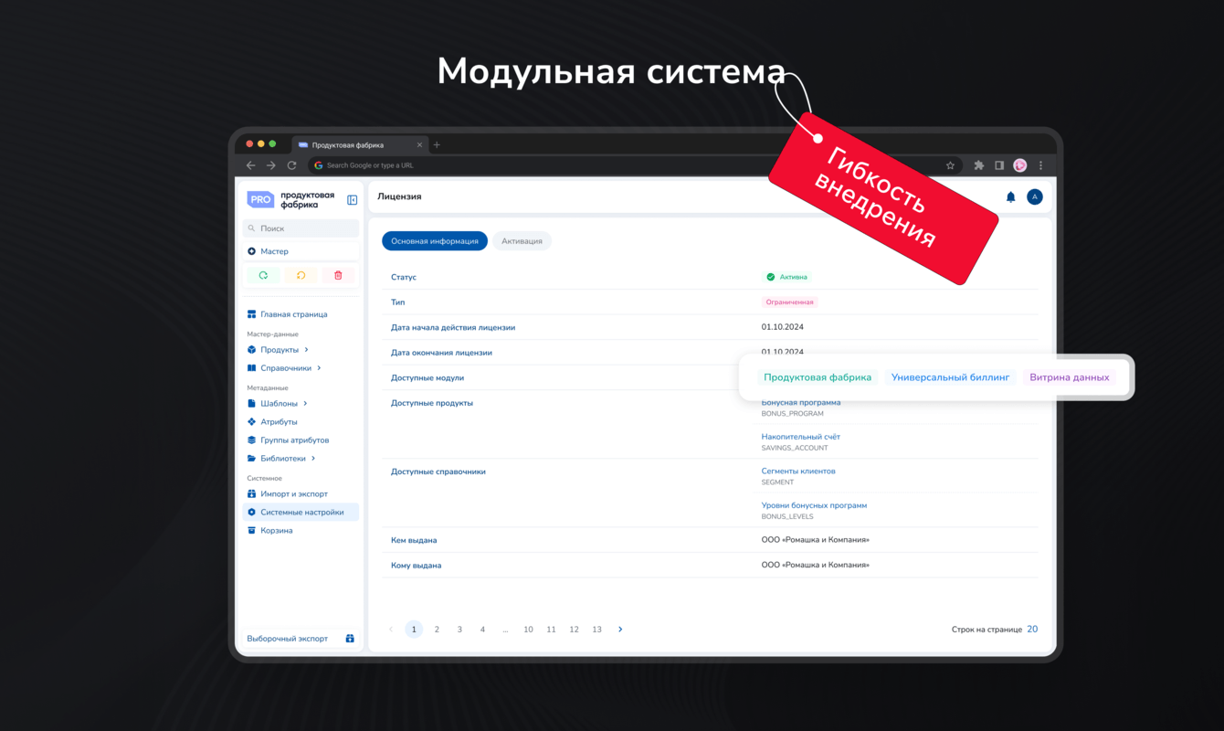 Первое — модульность. Платформу можно внедрять целиком или по частям. Например, один из клиентов захотел использовать только конструктор продуктов как самостоятельный модуль — без витрины и биллинга на первом этапе. Платформа это позволяет.