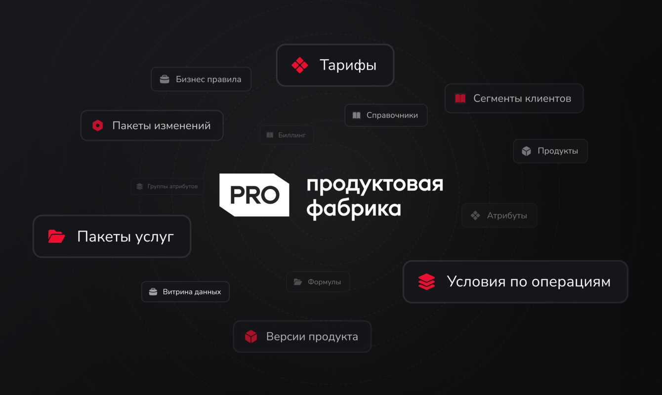 - Продуктовая фабрика забирает на себя продуктовую логику, тарифы, описания и расчёты.