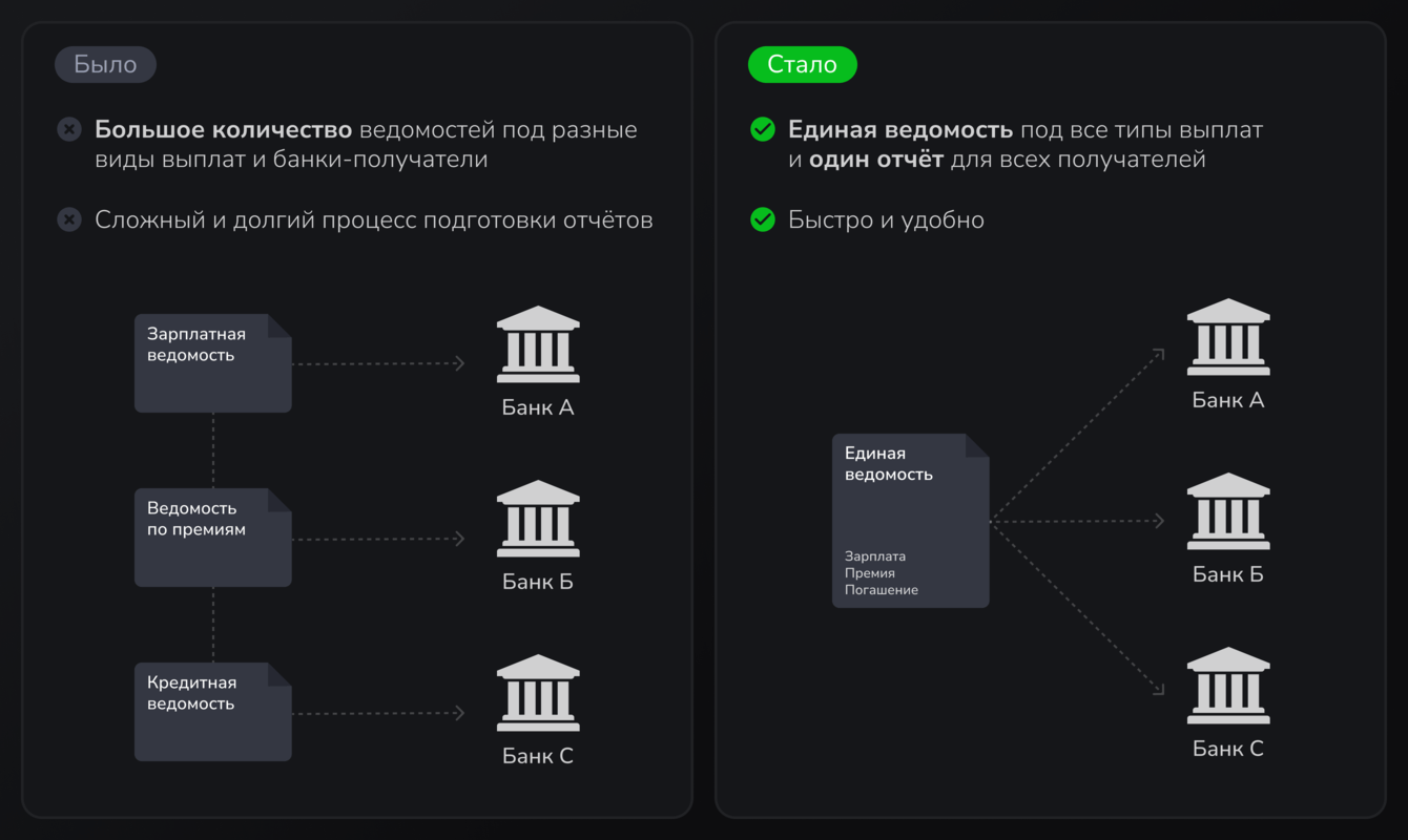 Одновременно банк смог упростить и клиентский сценарий зарплатного проекта. Раньше корпоративным клиентам приходилось готовить несколько ведомостей под разные виды выплат и банки-получатели. Теперь достаточно передать одну ведомость, внутри которой могут быть разные типы выплат. Это существенно упростило сценарий для бухгалтерии и сделало продукт заметно удобнее для бизнеса.