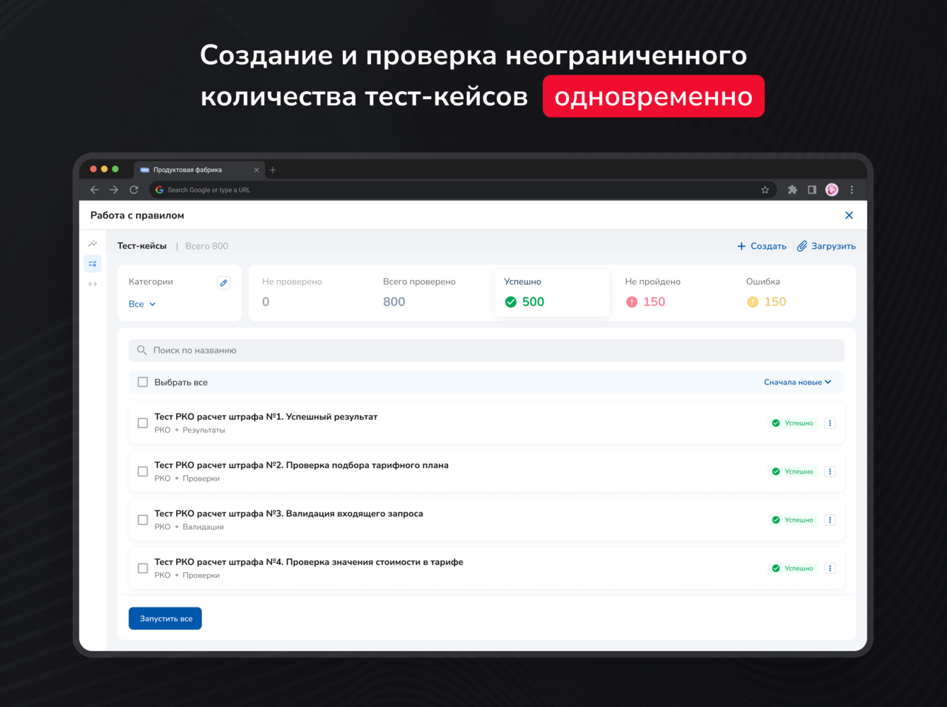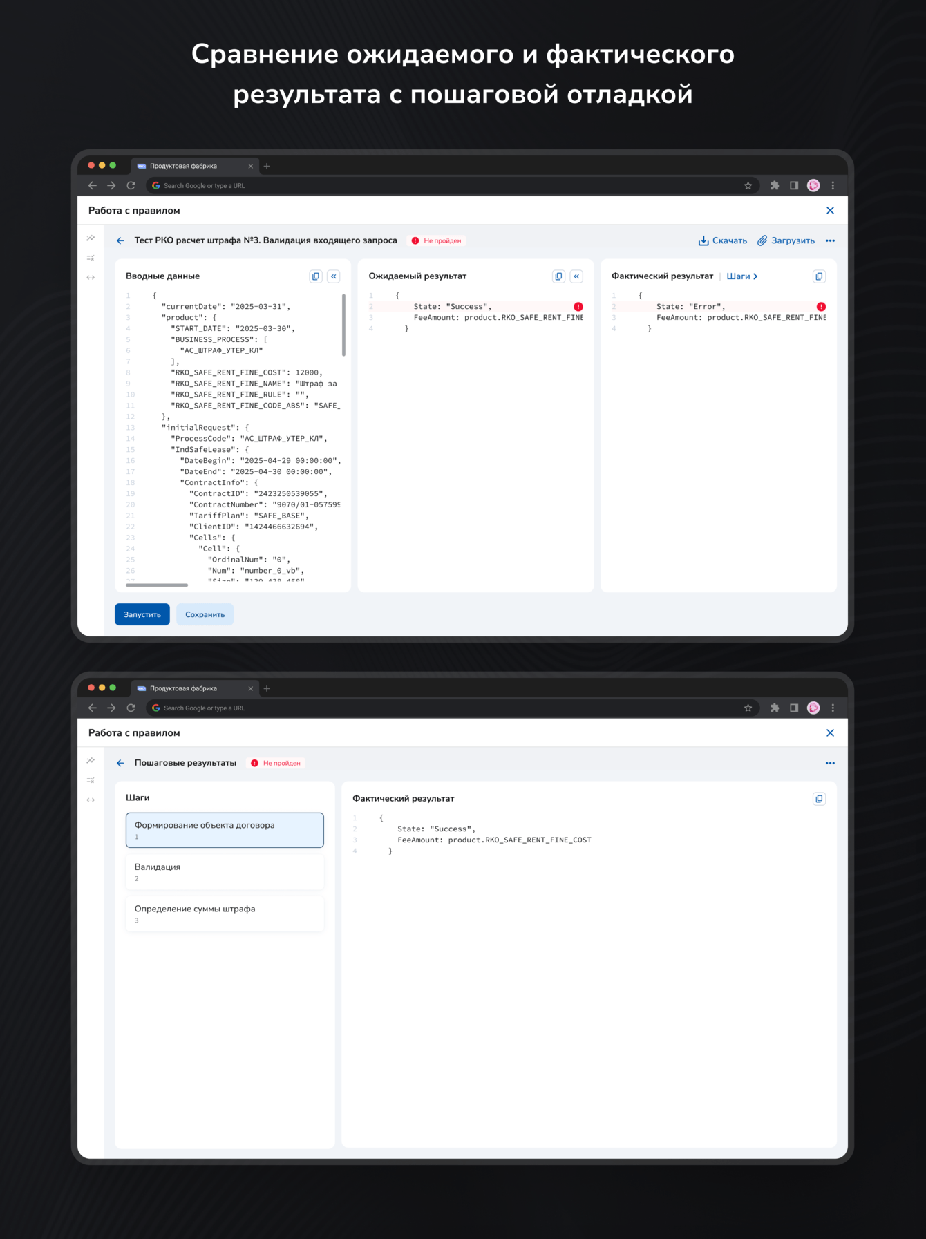 Банк также может запускать набор таких проверок по разным сценариям — например, по всем ключевым вариантам расчёта комиссии, ставки или бонуса. Результат отображается в понятном виде: какие сценарии отработали корректно, где есть отклонения и в каком именно месте расчёт пошёл не так.